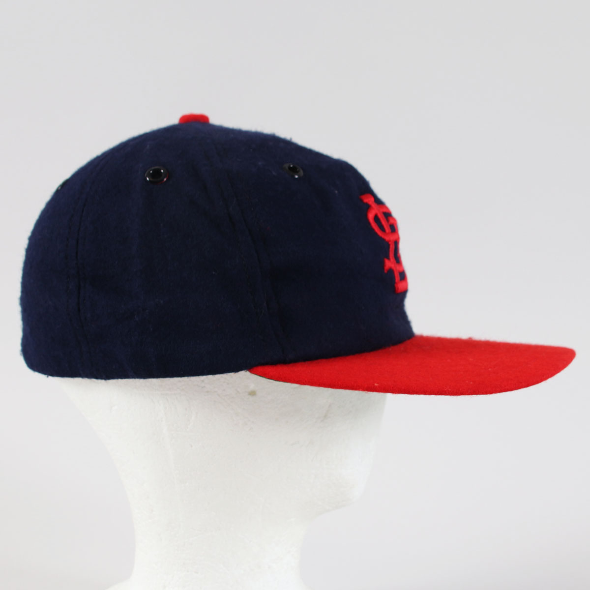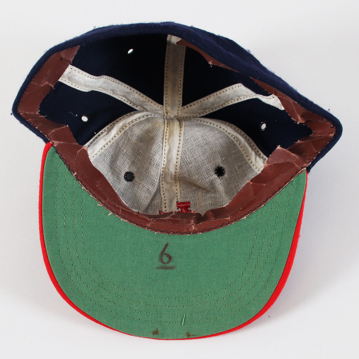 Presented is a vintage 1950’s St. Louis Cardinals hat. This is the same style that the players wore in that era with a red brim, and navy felt top. This cap, other than the exterior identifiers (“SL” logo) has no branding or tags (size) in the interior. Great wear is shown on the cap with heavy use including the cracked leather band, sweat stains etc. A “6” is written under the bill in thick black felt tip most likely added on after the era in black marker. The hat is unattributed to any specific player including Stan Musial.