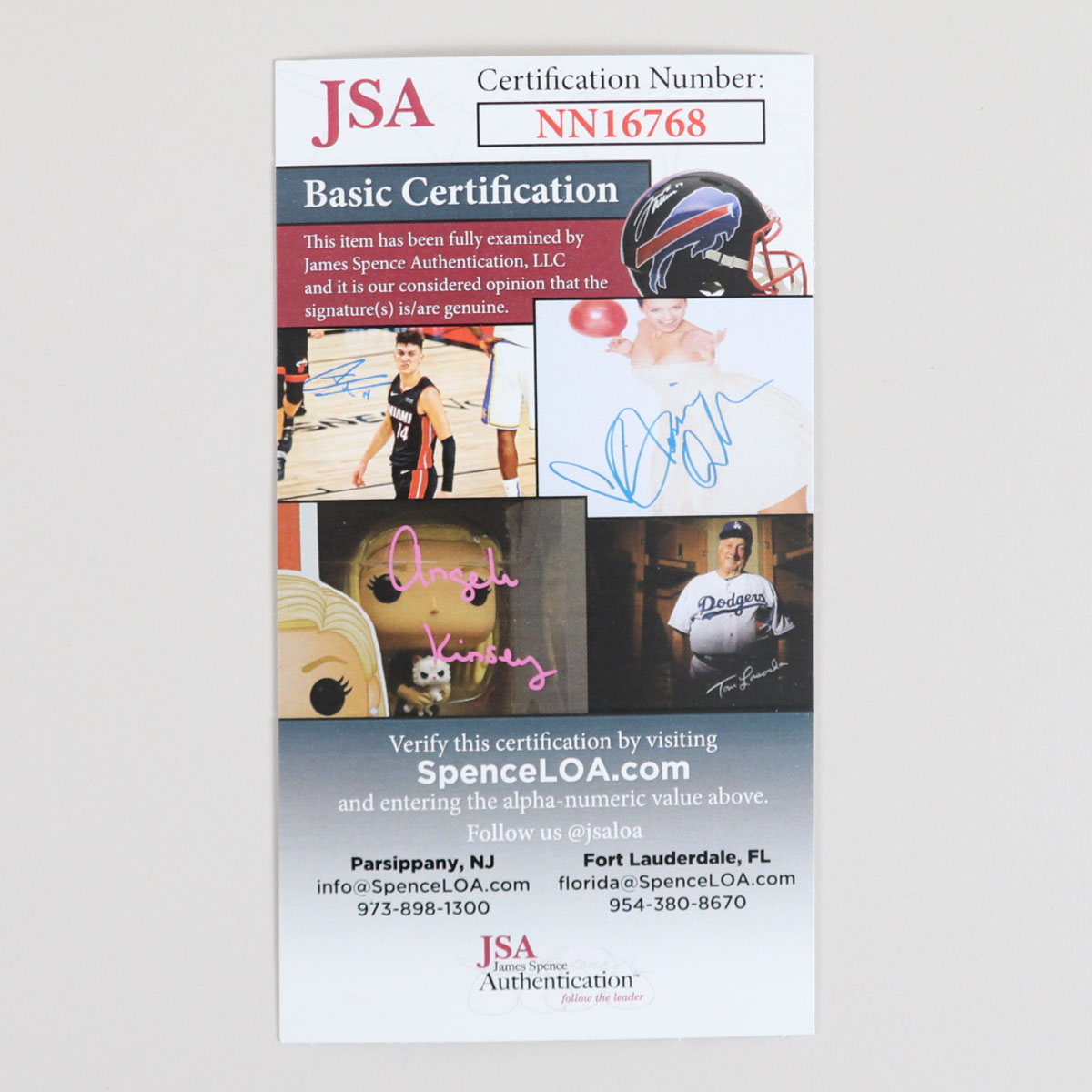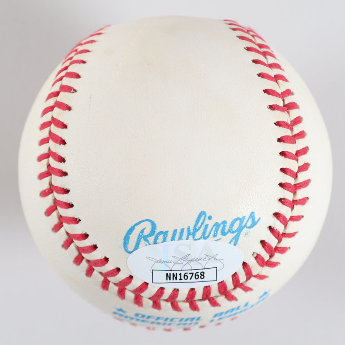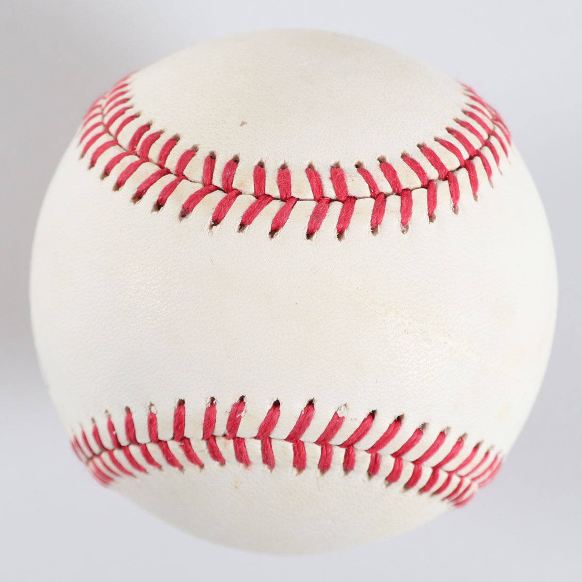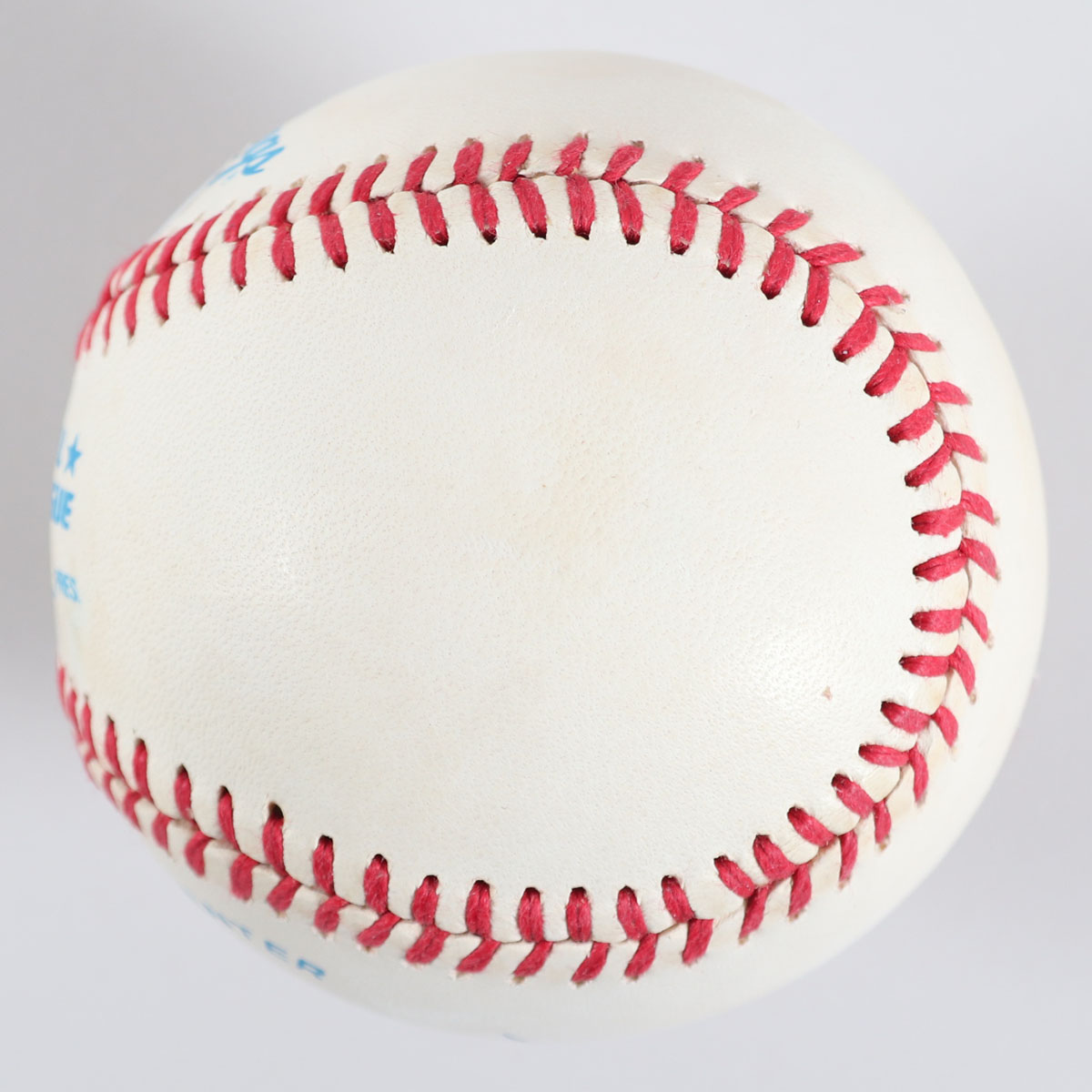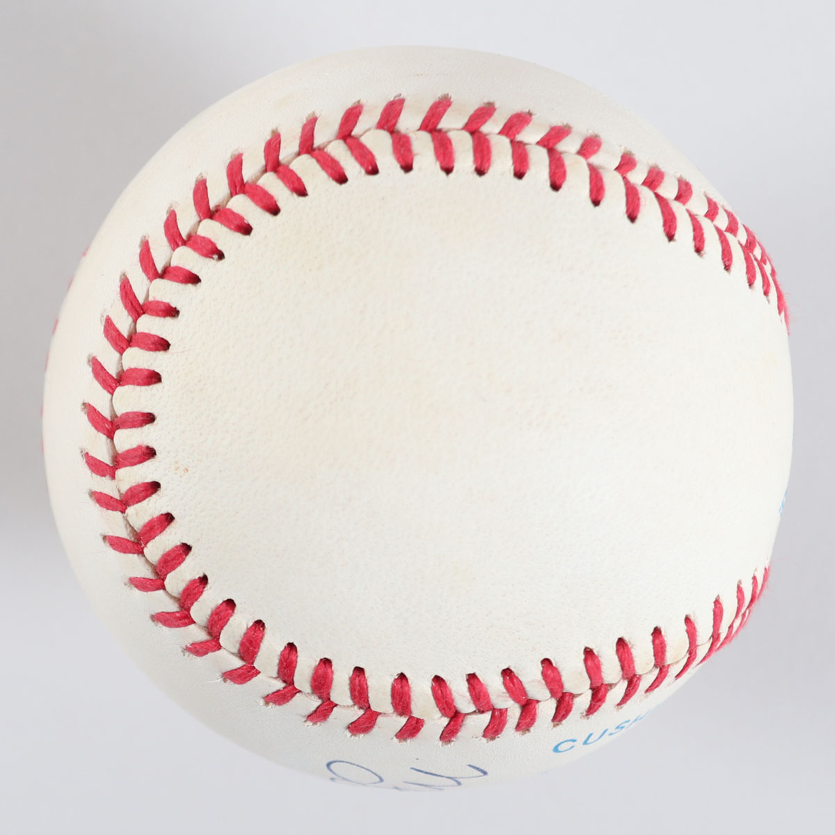 Presented is an OAL (Brown) baseball autographed by Mel Allen. He signed it on the side panel in a blue ballpoint pen (“9”).
