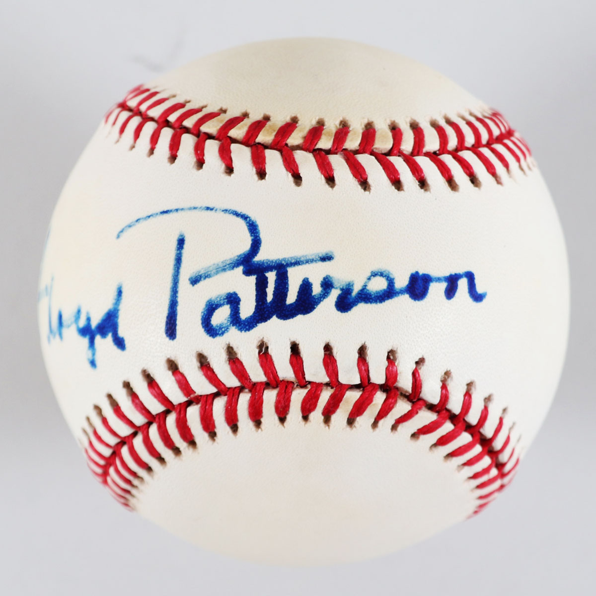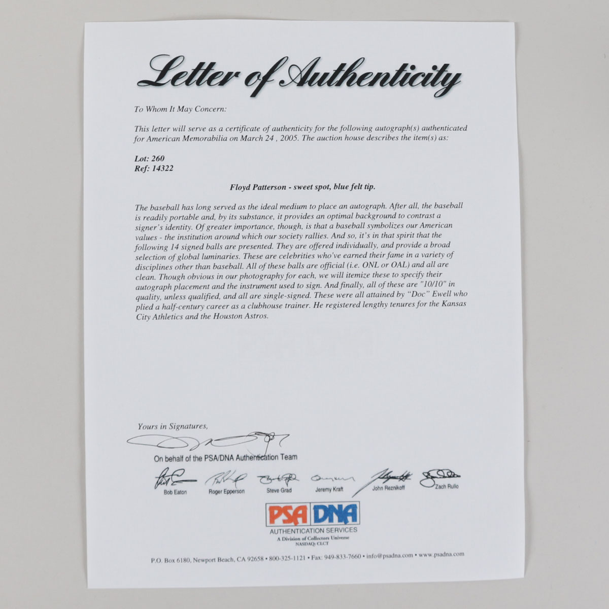 Presented is an OAL (Budig) baseball autographed by Floyd Patterson. He signed it on the sweet spot in blue felt tip (“7”). The ball itself shows toning from age.