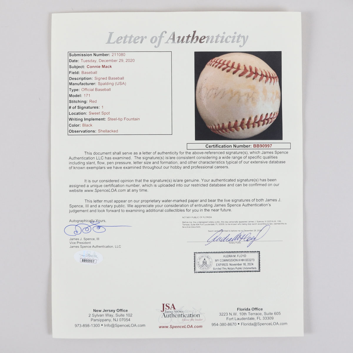 As is evident in our title, this ball hosts the singular penning of Connie Mack. Placed on the sweet spot on a lightly coated Spalding baseball responsible, projecting at a strength of about “4-5” black fountain pen. Authentication: JSA Full Letter