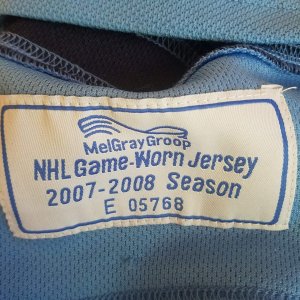 As Memorabilia Experts, we always have to watch out for “non authentic” tagging that always somehow seems to emerge from the depths. Someone made up their own version of a MeiGray Group tag. This one was found on a hockey jersey.