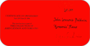 “Certificate of Ownership Sale 5197 June 23, 1984, This item has been a part of The Collection of John Lennon and Yoko Ono John Lennon’s Baldwin Acrosonic Piano” Signed Yoko Ono.