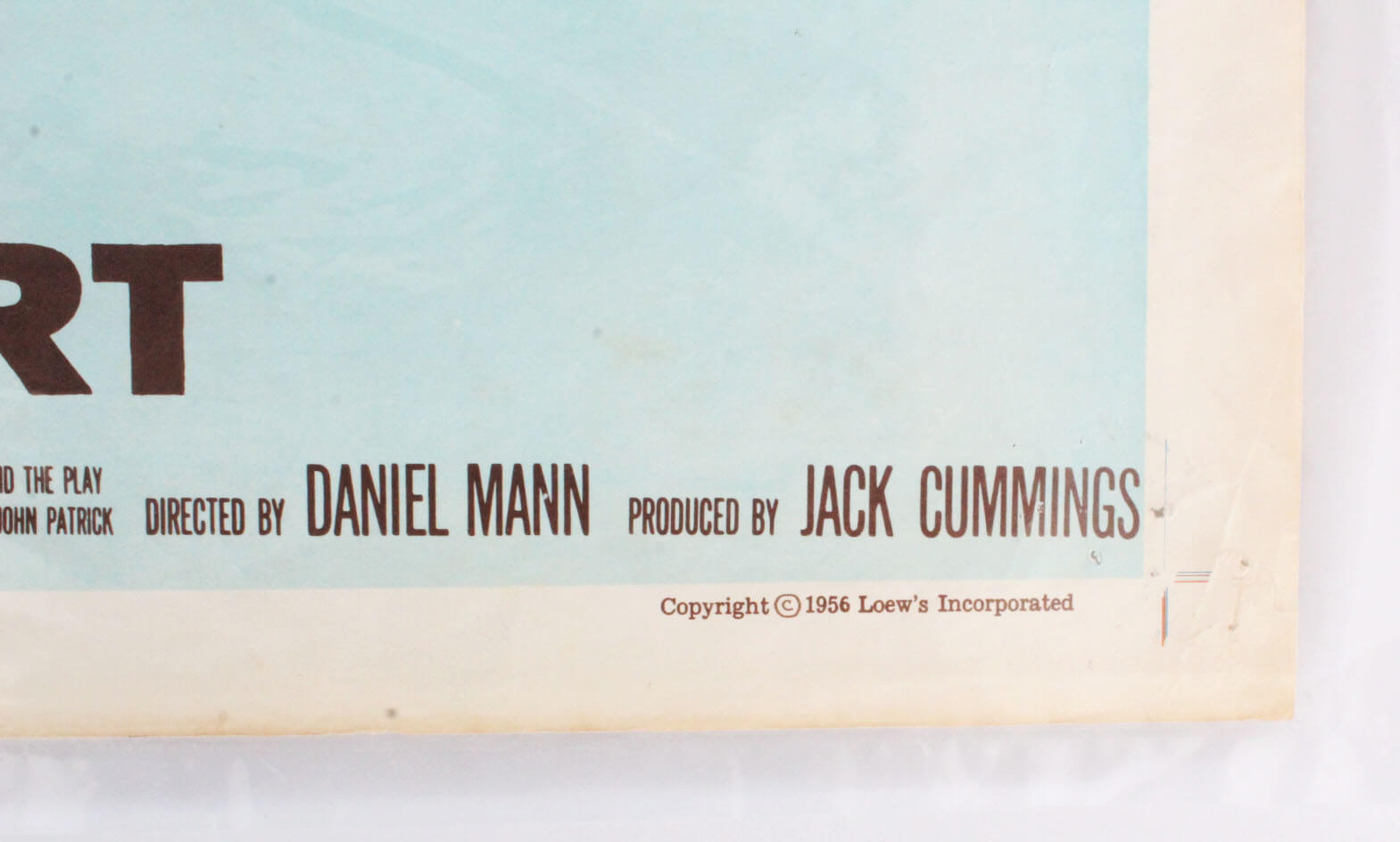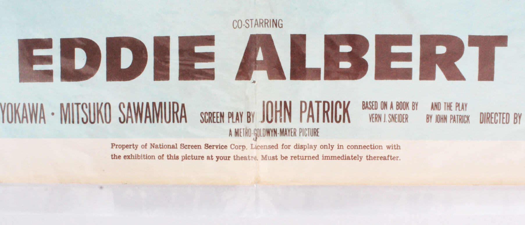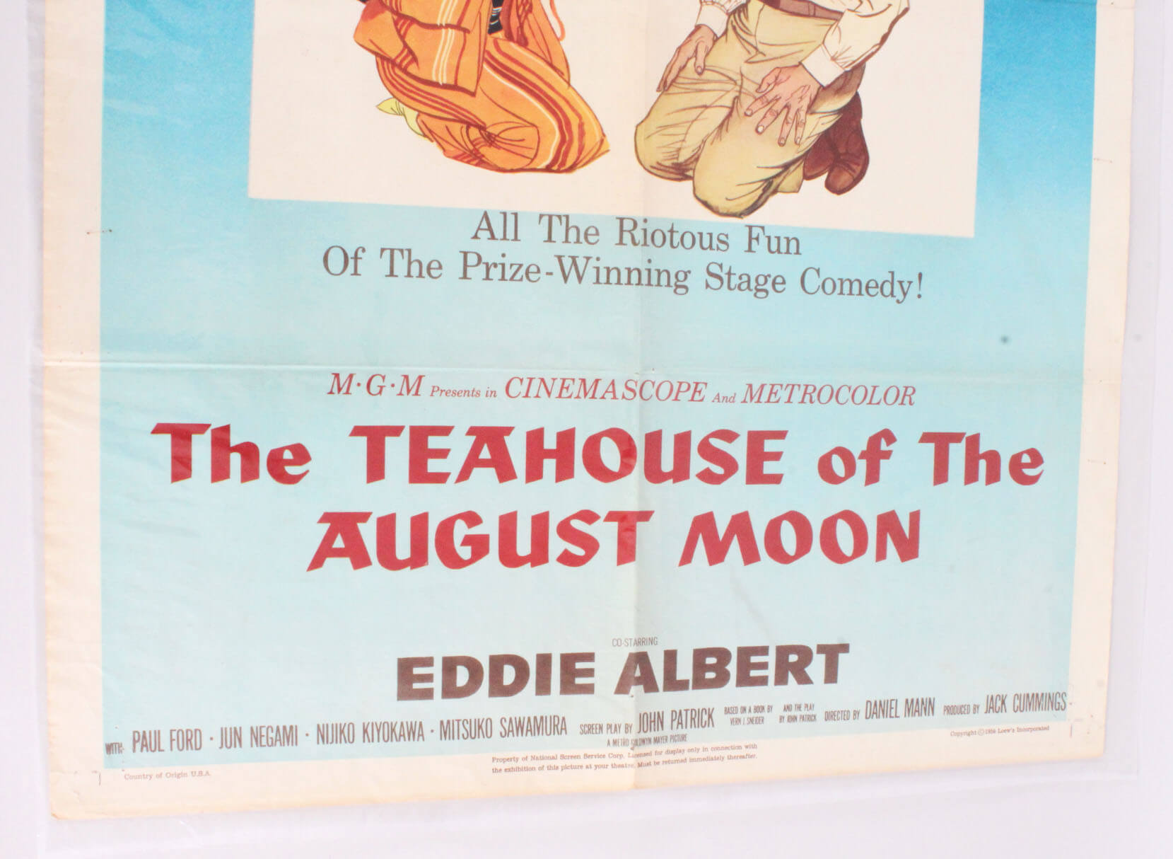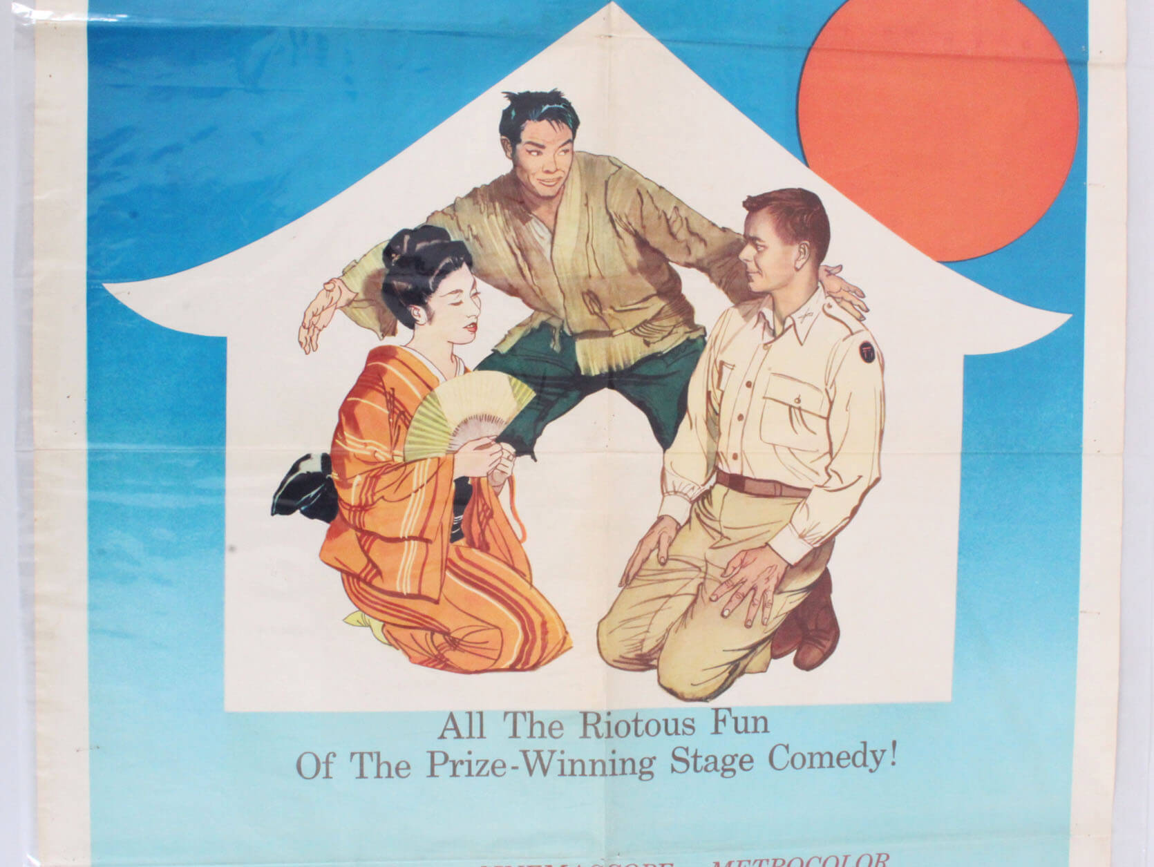 The Teahouse of the August Moon, the 1956 Daniel Mann post-World War II (WWII) occupied-Japan comedy (“MGM presents in CINEMASCOPE and METROCOLOR”; “All the riotous fun of the prize-winning stage comedy!”; “Based on a book by Vern J. Sneider and the play by John Patrick”) starring Marlon Brando (“as that rascal Sakini…”), Glenn Ford (“as eager beaver Capt. Fisby”), Machiko Kyo (“as geisha girl Lotus Blossom”), Eddie Albert, Paul Ford, Jun Negami, Nijiko Kiyokawa, Mitsuko Sawamura, and Harry Morgan.