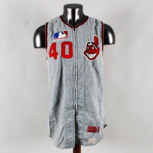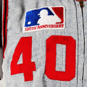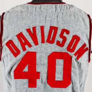 “Davidson” player name on back is sewn on directly onto the flannel in red felt with zig zag stitching.  “40” player number also sewn on back with dazzle cloth numerals with zig zag stitching and the player numeral also sewn on front chest underneath the Anniversay patch.