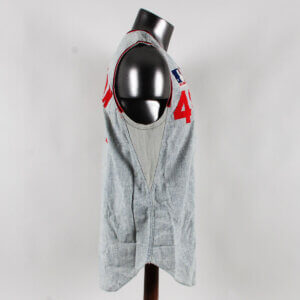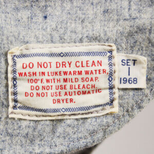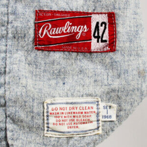 Rawlings size “42” tagging is sewn into the front bottom tail of the vest flannel.  The Do Not Dry Clean Wash tag is sewn on about 2 inches underneath the Rawlings tagging with a flag tag “Set 1 1968”.