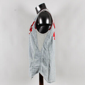 1968 Atlanta Braves Game-Worn Jersey Vest Flannel Ted Davidson.  This rare vintage road gray flannel vest comes directly from the Ted Davidson familly.  It is the vest that Atlanta Braves gave to Ted Davidson.  It has the 100th Year Anniversary Patch on the front chest.  It is a zipperfront flannel vest with the Braves Indian Chenille logo patch sewn onto the front left side of the vest.  Vest has the red/black/red piping along the neck and sleeves.  Gray dazzle cloth is sewn in under the arms and side seam of the jersey.