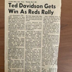 Ted Davidson pitched in 114 major league games from 1965 to 1968, posting a career ERA of 3.69 and striking out 124 batters. A left-handed reliever with a deceptive delivery, Davidson debuted with the Reds in style, striking out four Astros in 2.2 scoreless innings and inducing a double play from future Hall of Famer Joe Morgan—the first batter he faced in his career. His best season came in 1966, when he recorded a 3.90 ERA over 54 relief appearances, 21 games finished, and four hard-earned saves. The Reds expected him to take on a larger role in 1967, but a domestic shooting incident that spring left him seriously wounded and delayed his return until June. He was traded to the Atlanta Braves in June 1968 and made his final MLB appearance on July 28. Though his career was brief, Davidson’s resilience and early promise remain part of baseball’s complex tapestry.