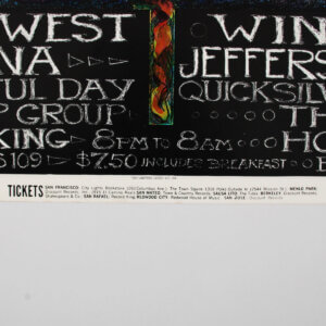 The 1969 Santana Jefferson AirplaneĀ Hot Tuna New Year’s Eve concert poster, designed by Bonnie Maclean, is a striking representation of the era’s vibrant art and music scene. As part of Bill Graham’s iconic Fillmore and Winterland venues, this piece captures the essence of a transformative period in rock history. The bold colors and intricate designs reflect the energetic atmosphere that defined Santana’s performances. This collectible item not only serves as a visual artifact but also embodies the cultural significance of live music during the late 1960s. This is a first-printing poster only, in Ex/Mt condition. Measures approximately 20 3/4 inches by 27 3/4. A very large poster!