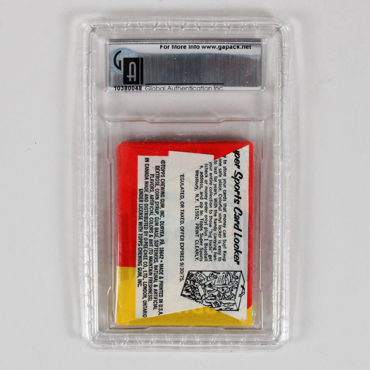 1975 Topps Baseball Mini Unopened Wax Pack Graded GAI 9.5 Gem Mint. This super-desirable, unopened, and factory-sealed wax pack of 1975 Topps Mini Baseball cards could contain Mint-condition examples of various stars, Rookie cards, and more.