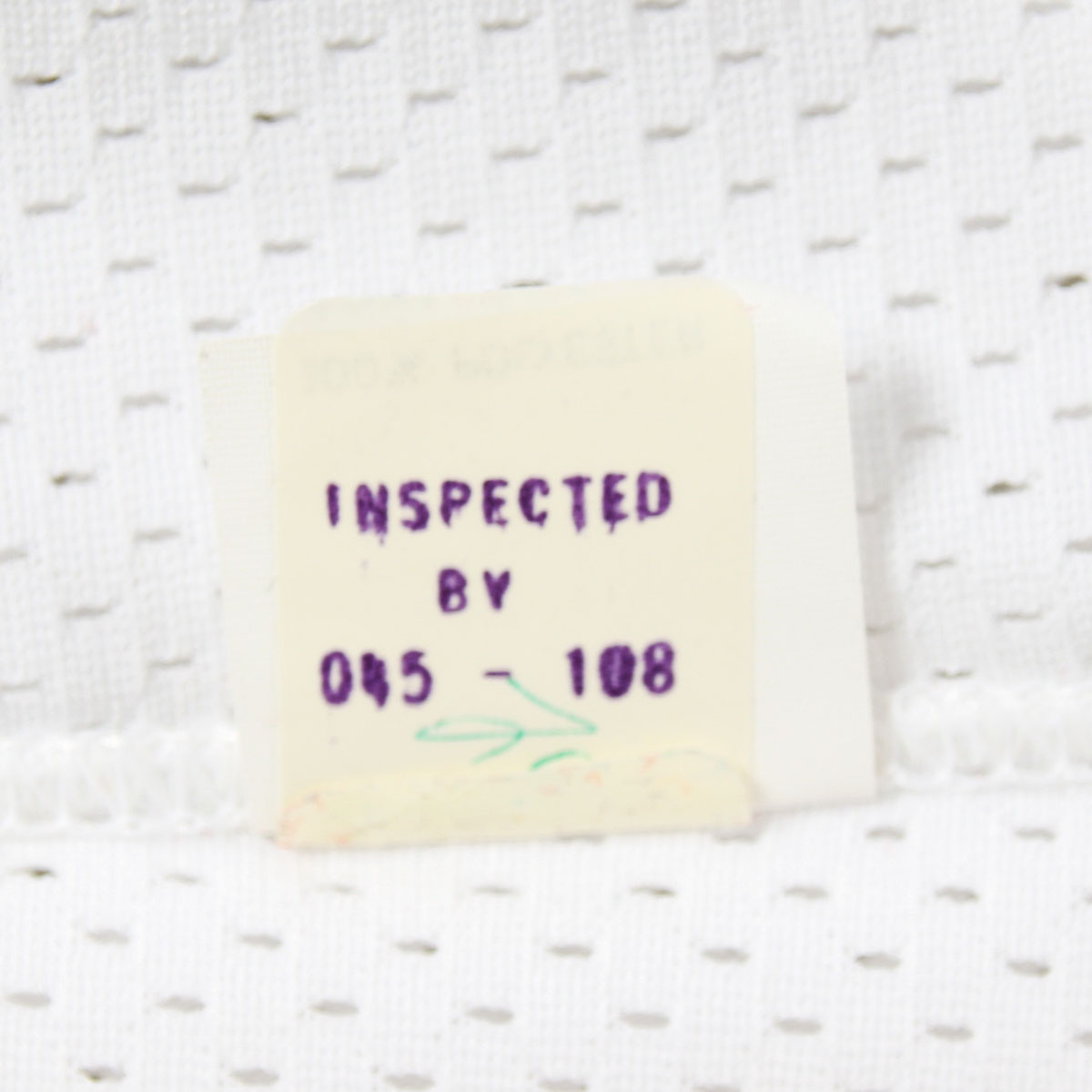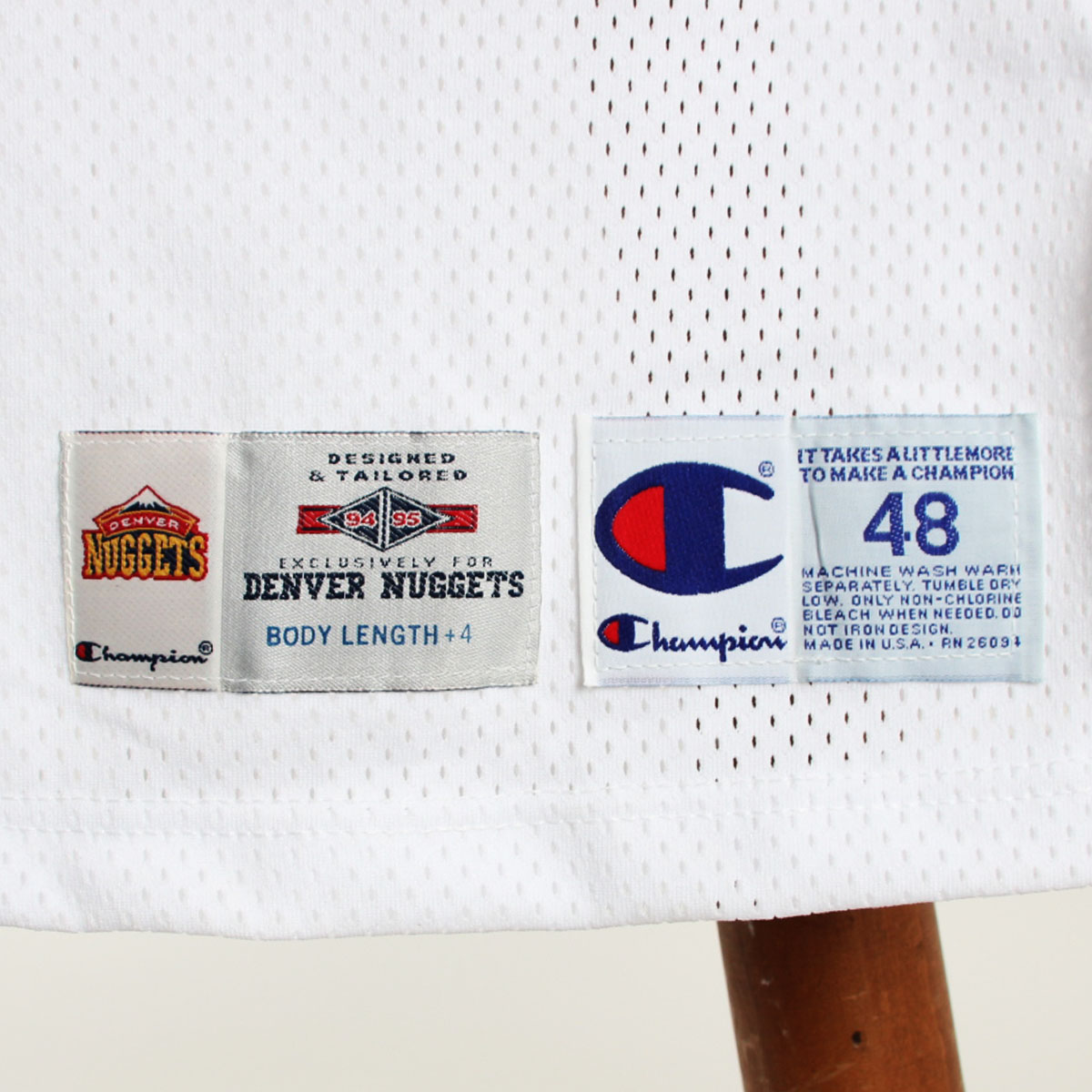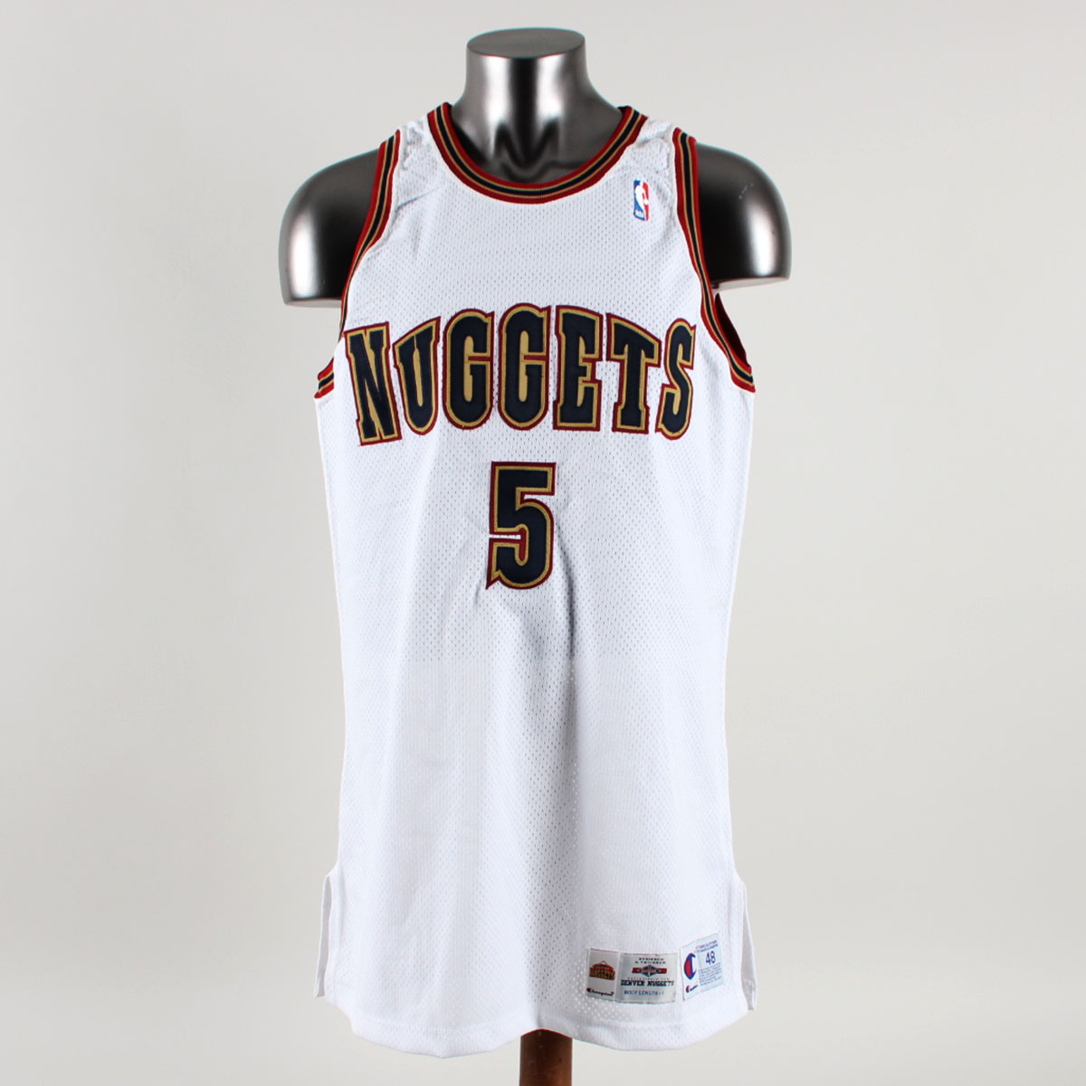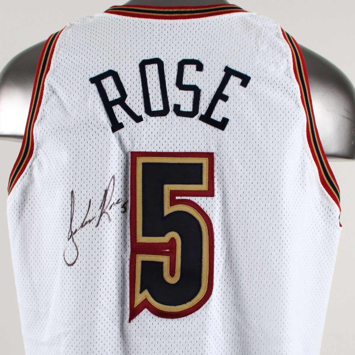 Presented is a Denver Nuggets jersey that was game worn by Jalen Rose during his rookie season 1994-95. On the chest is the Nuggets team logo patch in navy with red and gold accents. Below is his number “5” done in matching tackle twill. On the front left tail are two tags with the first being a Denver Nuggets exclusivity tag and the other is the Champion manufacturer’s tag with wash instructions [size] “48”. Across the back reads the player name “ROSE” done in navy tackle twill sewn directly into the white mesh jersey with his number “5” below. In the interior inseam is an inspection/fabric materials (100% Polyester) tag. This jersey is properly tagged and shows appropriate use with thread fraying and malleable tagging. It is also highlighted by Rose’s autograph on the back in felt tip (“9”).