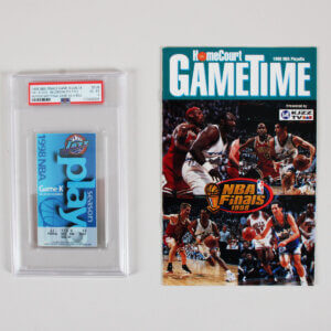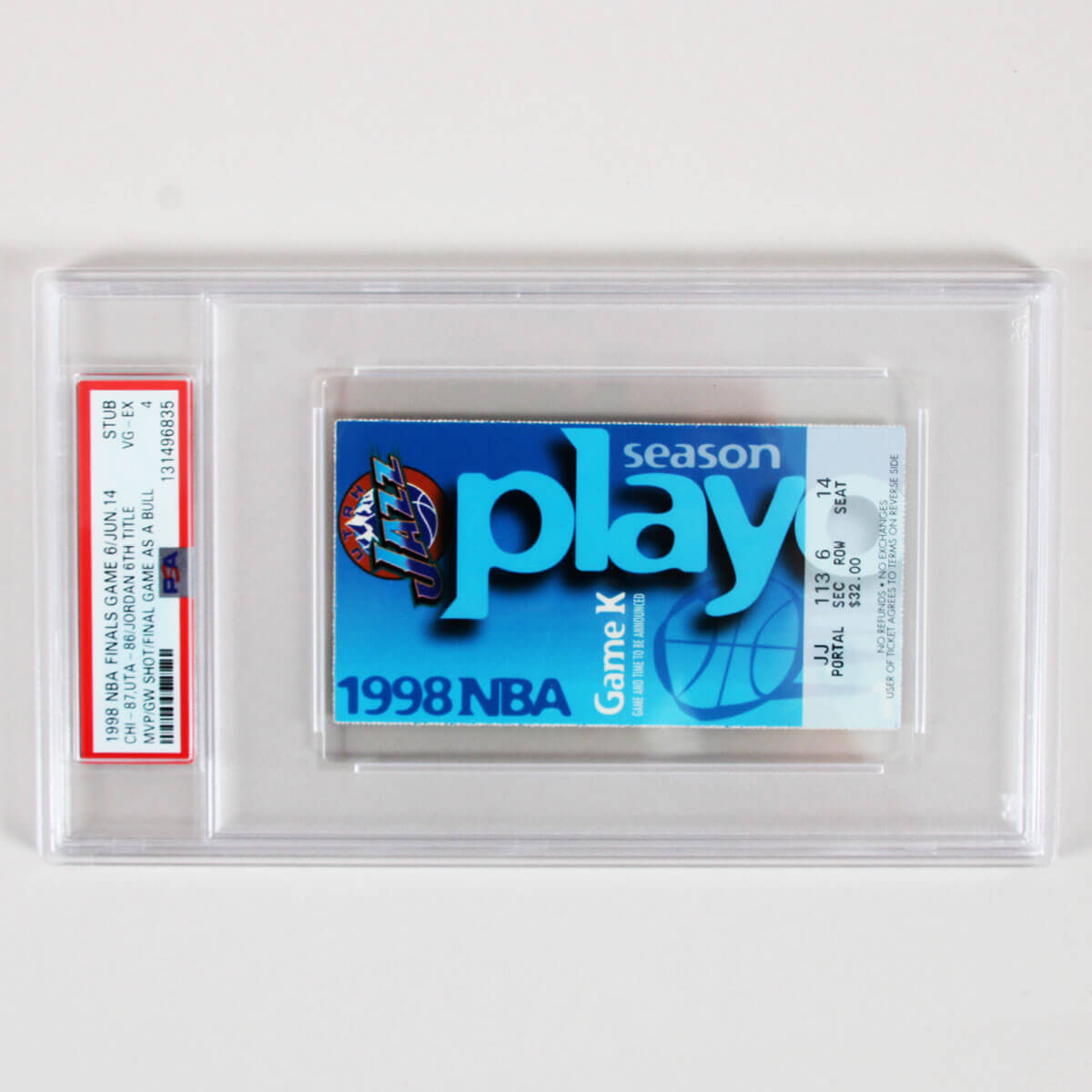 1998 NBA Finals Game 6 Bulls Jazz Ticket Stub Michael Jordan-The Shot PSA 4 VG/EX. This is an extremely rare Michael Jordan ticket stub from MJ’s last final game with the Bulls. Also included is the original program that came with the ticket.