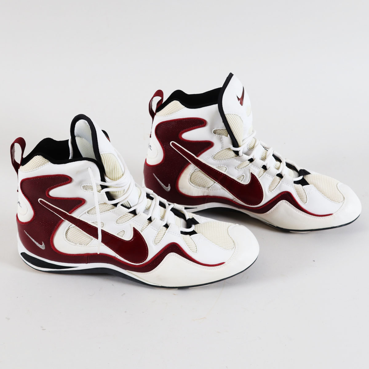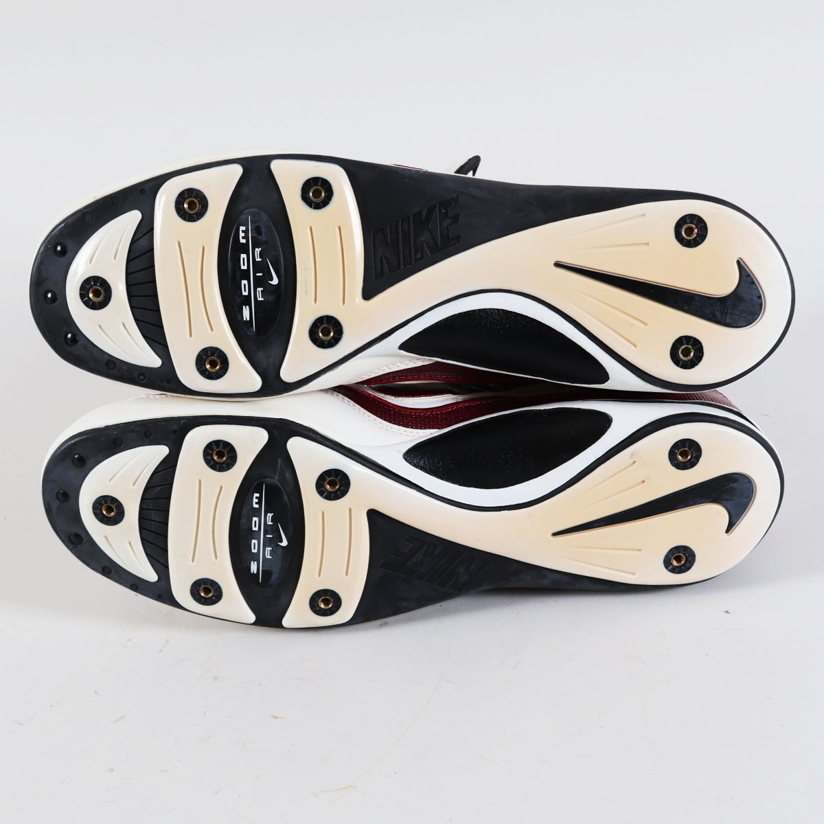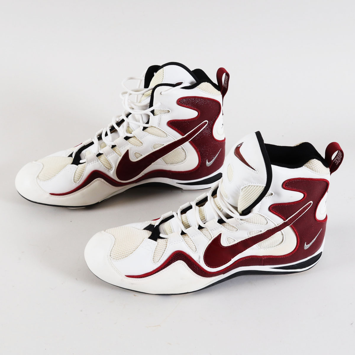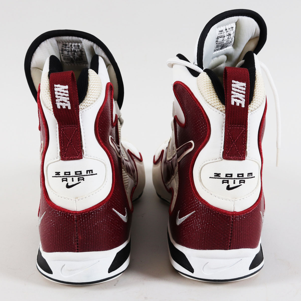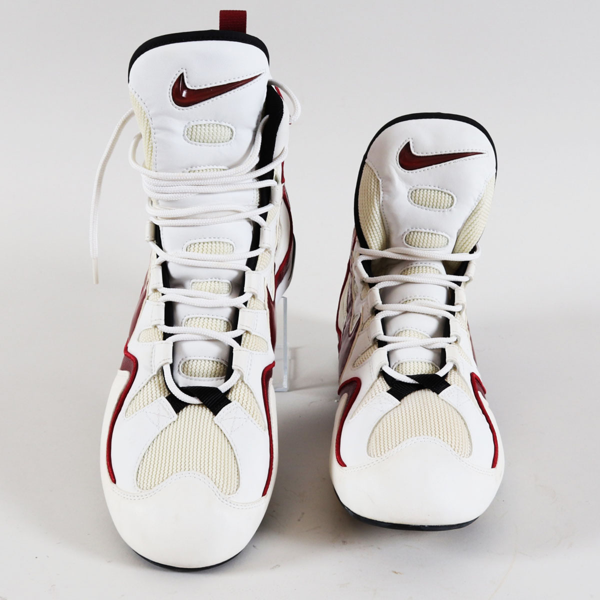 These are Terrell Owens game-issued cleats from his time with the San Francisco 49ers in 2000. Nike Zoom Air cleats sport a red, white and black colorway. Interior tagging reports a size “15” and correct coding. There are no cleats (grippers) on the bottom.