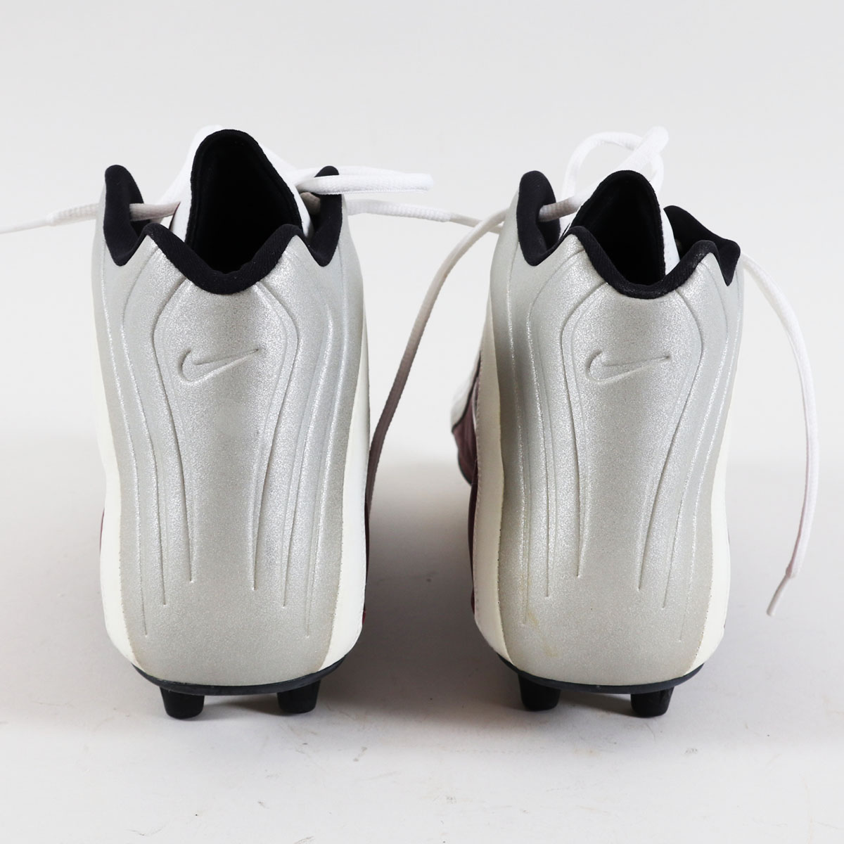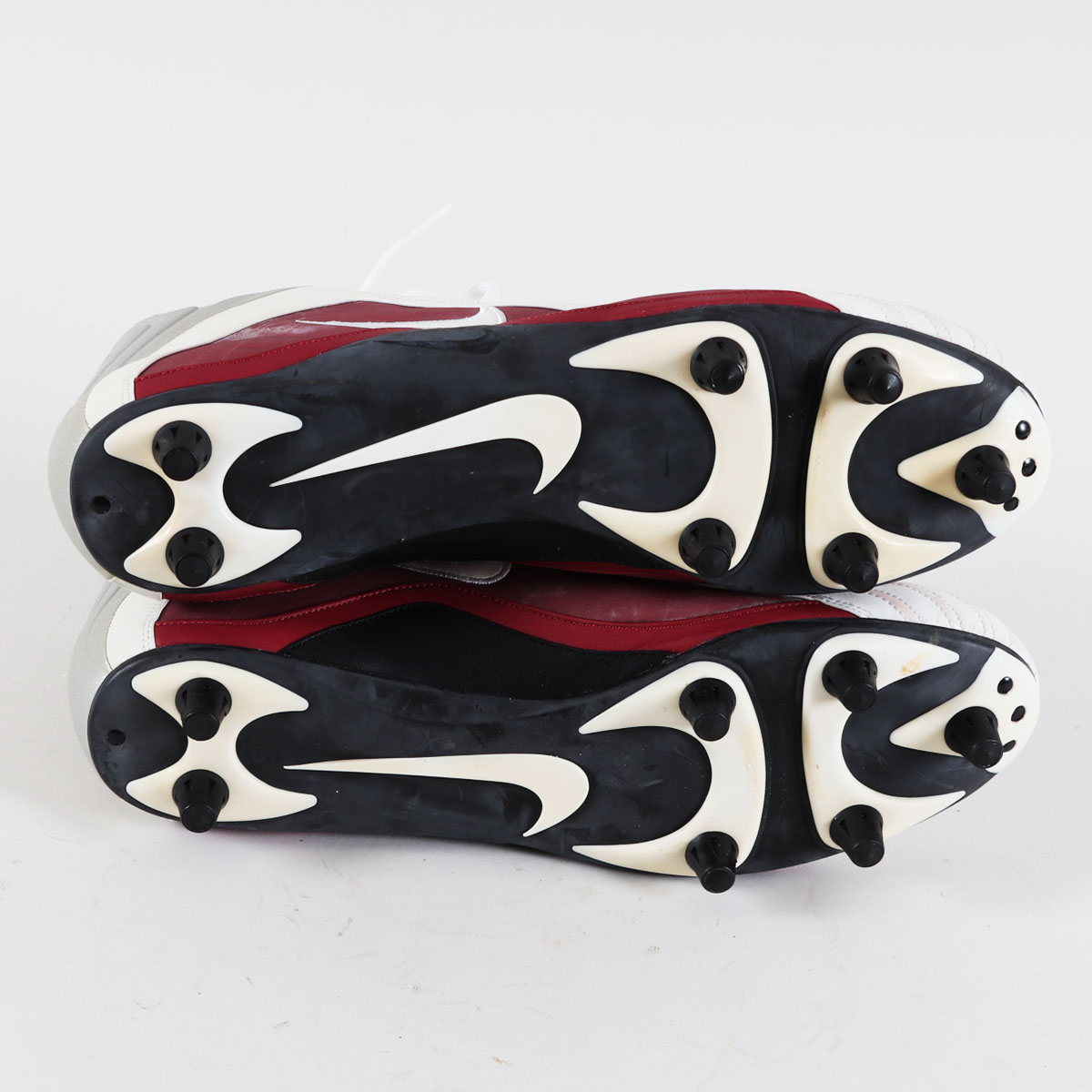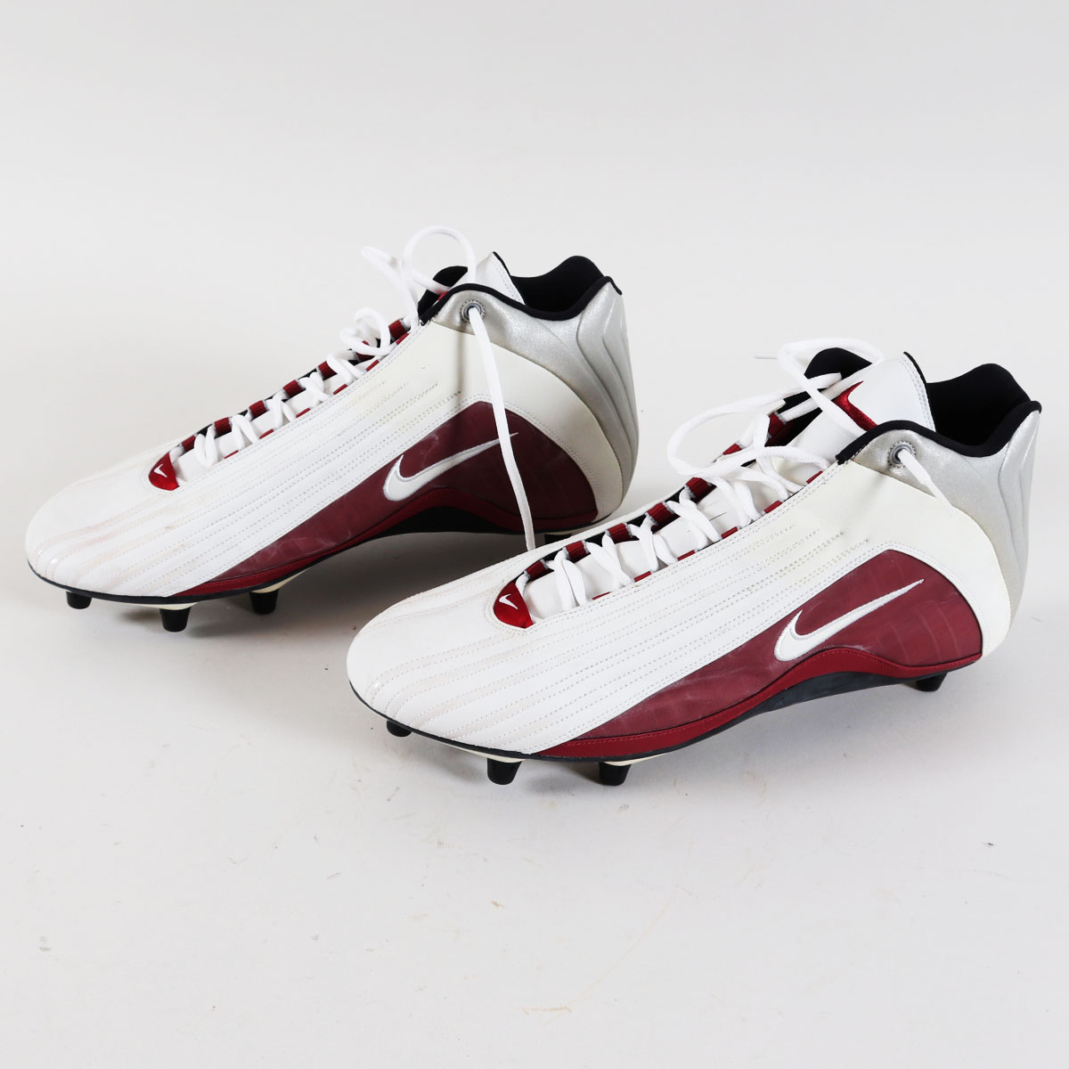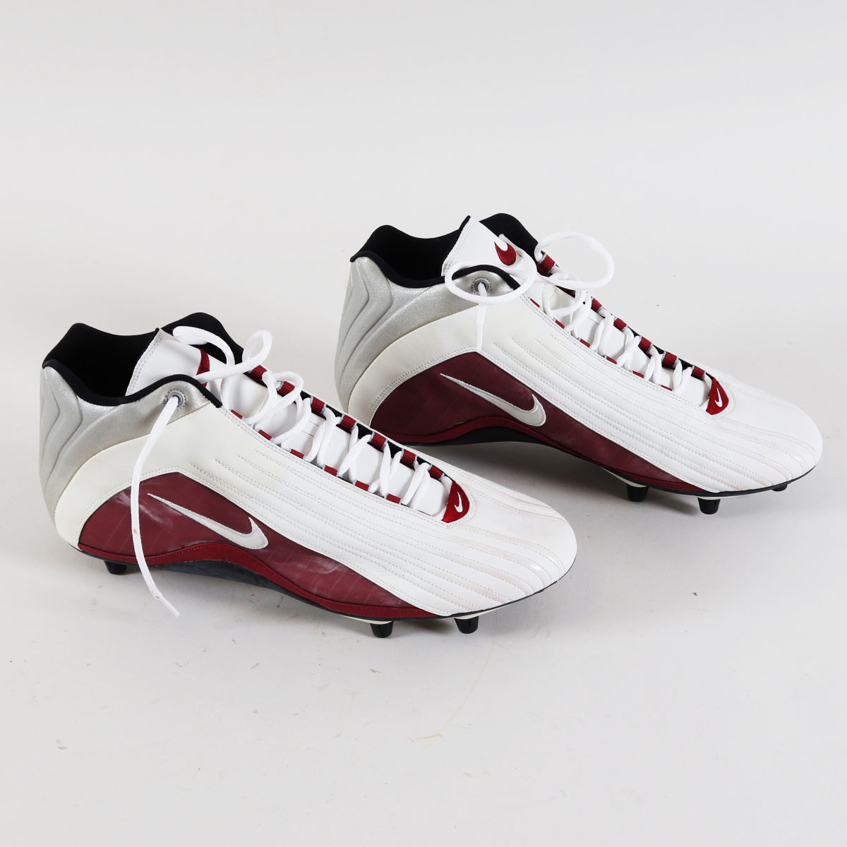 These are Terrell Owens game-worn cleats from his time with the San Francisco 49ers in 2001. Nike cleats sport a red, white and gray colorway. Interior tagging reports a size “15” and correct coding dated to 2001. Mild game wear is evident with scuffs and transfer marks.