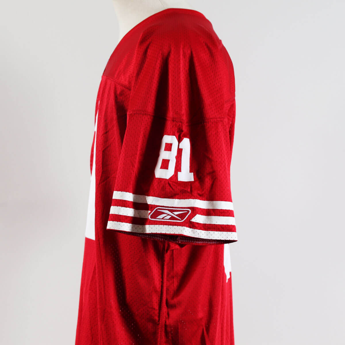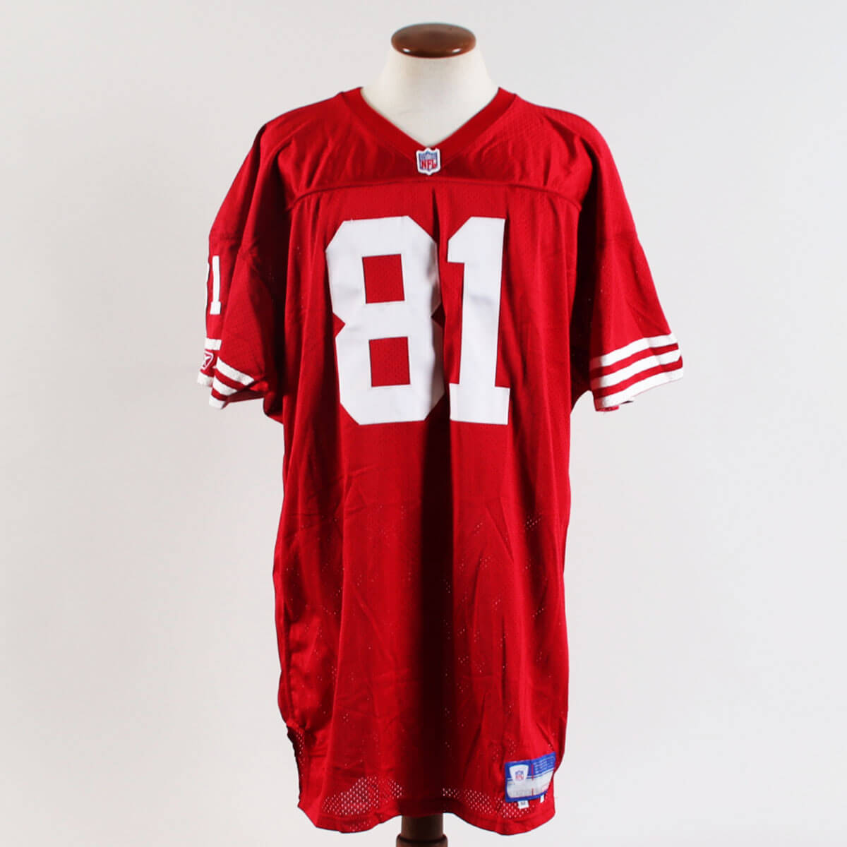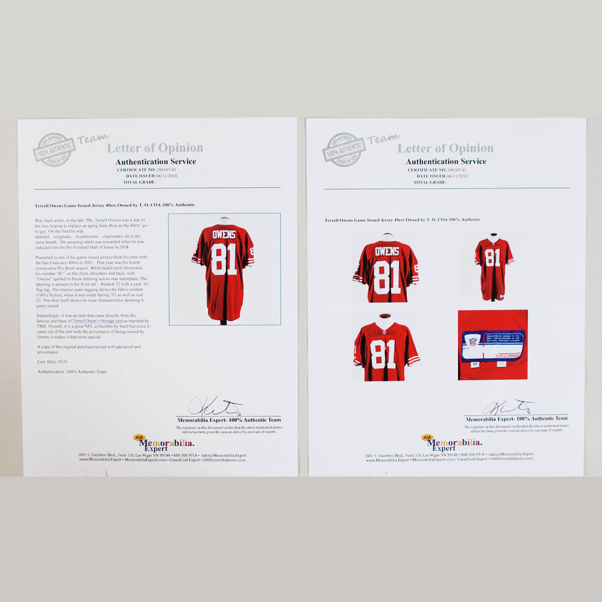 Presented is one of his 2003 game issued jerseys from his time with the San Francisco 49ers in 2003. That year was his fourth consecutive Pro Bowl season. White tackle twill showcases his number “81” on the chest, shoulders and back, with “Owens” spelled in block lettering across rear nameplate. The labeling is present in the front tail – Reebok 52 with a year ’03 flag tag. The interior seam tagging shows the fabric content (100% Nylon), when it was made Spring ’02 as well as size 52. The shirt itself shows no wear characteristics deeming it game issued. This was more than likely a carry over jersey from 2002.. They wore this style jersey in the November 25th 2002 game against the Eagles.