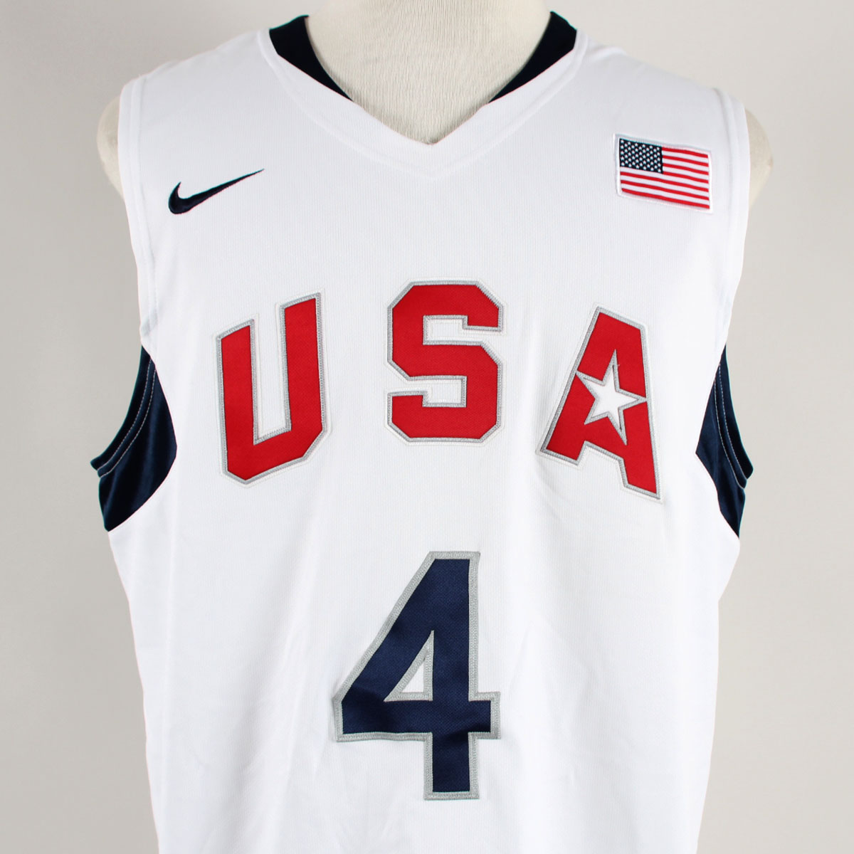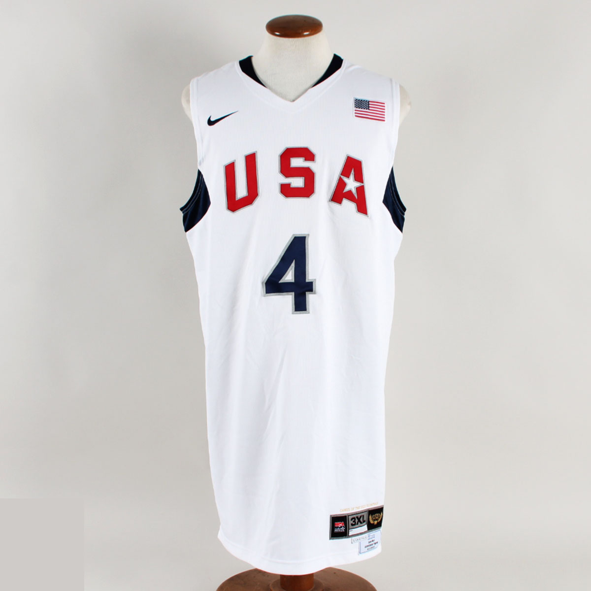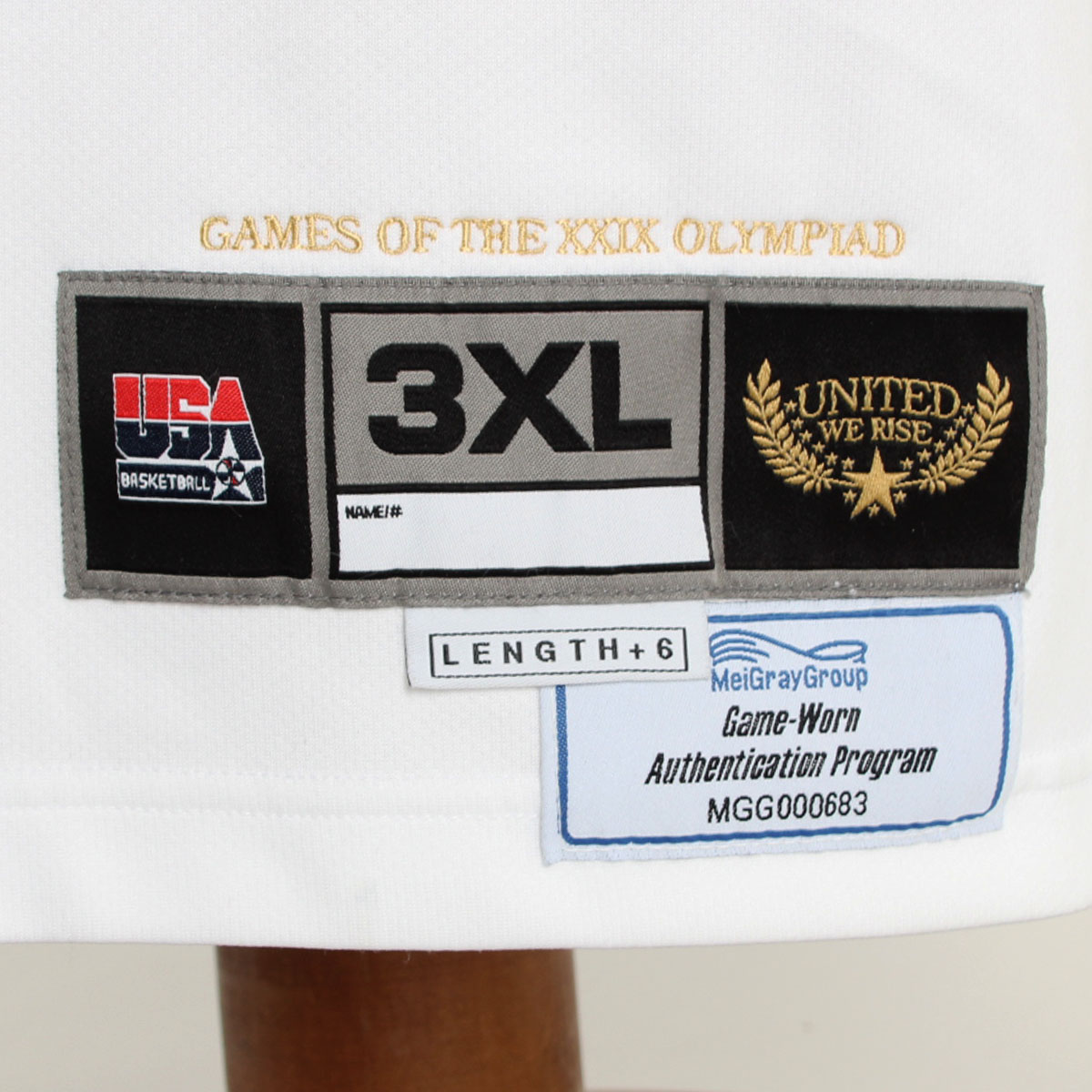 The collar tag features a Nike Size 3XL tag in collar. On the front left front tail,”Games of the XXIX Olympiad” stitched in gold with “USA Basketball”, “3XL”, “United We Rise”, “Length +6” and “MeiGray Group Game-Worn Authentication Program MGG000683” tags right below.