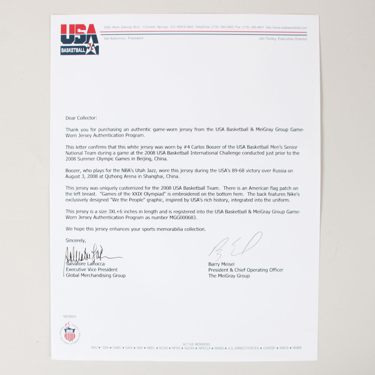 Presented is Carlos Boozer’s game worn jersey from the undefeated Gold Medal winning Team USA squad at the 2008 Beijing Olympics. The front chest features the red/gray/white tackle twill USA logo with his jersey number “4” below in blue/gray tackle twill along with the American flag. The verso has “BOOZER” in white/gray tackle twill and a navy/gray “4”. The back also features a unique exclusively designed “We the People” graphic integrated into the uniform inspired by United States history.