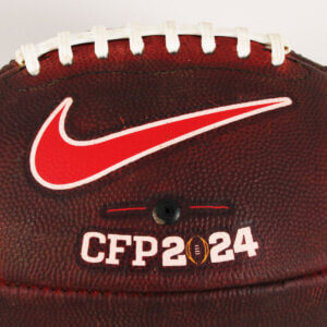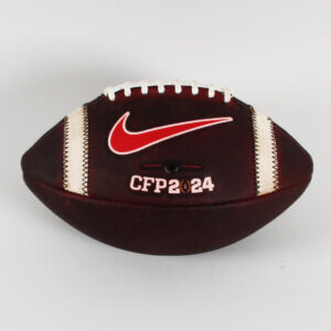 This is a Nike Vapor Elite football for the Alabama Crimson Tide, prepped for use in the 2024 College Football Playoff (CFP). It was fully game prepped and ready (“mudded” or “broken in”) but was not used in game. The bladder holds air, and the embossed logos are still fully intact.