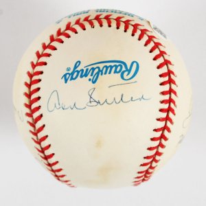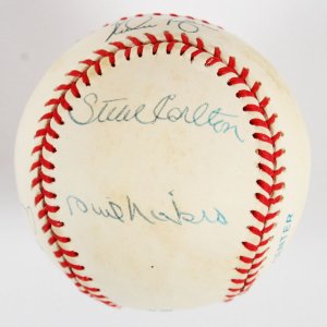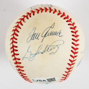 This exceptional collectible features the autographs of six legendary baseball pitchers, each of whom has left an indelible mark on the sport. The baseball is uniquely distinguished by the inscriptions denoting their remarkable achievements of 300 wins and 3000 strikeouts, a feat accomplished by only a select group of players. Notable signatures include those of Nolan Ryan, Don Sutton, Phil Niekro, Steve Carlton, Tom Seaver, and Gaylord Perry, all rendered in a vibrant blue paint pen that enhances the visual appeal of this item. The accompanying Certificate of Authenticity (COA) from JSA guarantees the legitimacy of the signatures, ensuring that this piece is a valuable addition to any serious baseball memorabilia collection. This signed baseball not only celebrates the storied careers of its signatories but also serves as a tribute to the rich history of Major League Baseball.