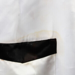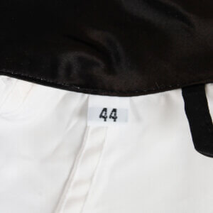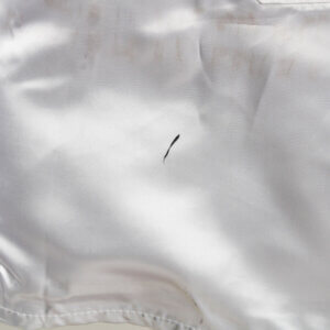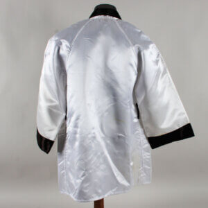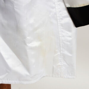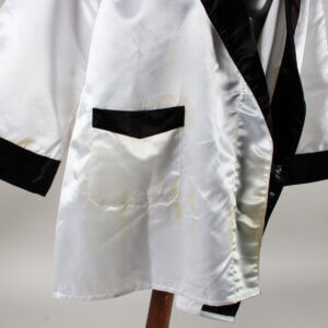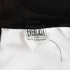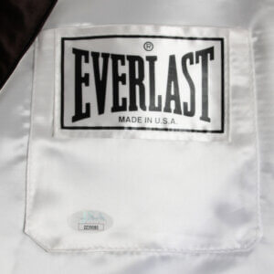 This Everlast white satin boxing robe, adorned with black trim on the cuffs, lapel, and pockets, is a remarkable piece of memorabilia. It features the autograph of the legendary Muhammad Ali, signed in black felt tip on the pocket, the quality is “7-8″, exhibiting some ink saturation. While the robe shows signs of storage wear and age discoloration (yellowing) in spots, including an errant mark from the signing and remnants of tape from previous display, its historical significance remains intact. Notably, authenticated signed robes by Ali are exceedingly rare, making this item a valuable addition to any collection.