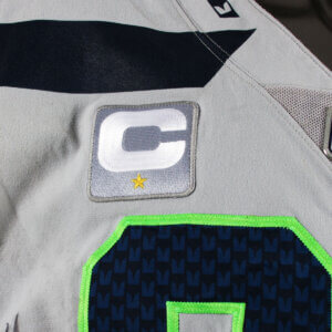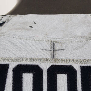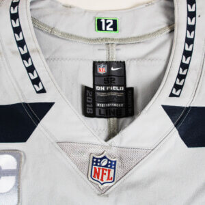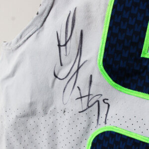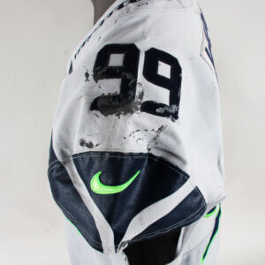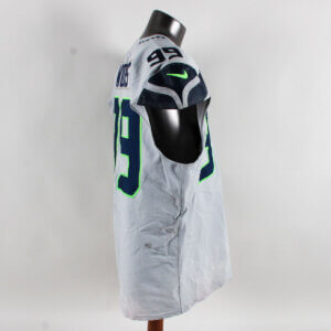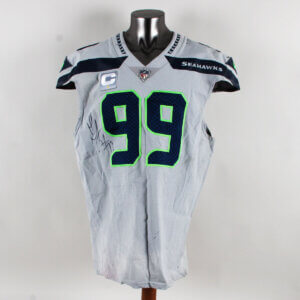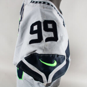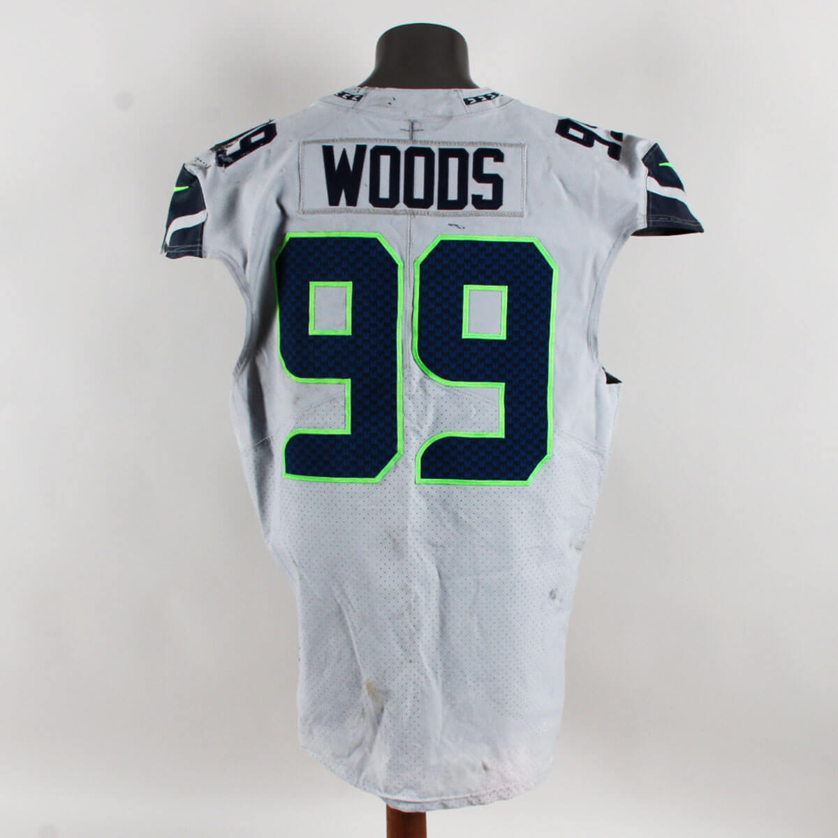 Presented is a Seattle Seahawks jersey in the light grey style that was worn by nose tackle Al Woods during his career. On the inside back collar is a Nike On Field manufacturer’s tag [size] 52 -LINE – 2018 . On the front, back, and on each shoulder is the player number “99” in navy/lime green tackle twill. Across the back is the player name “WOODS” in navy ackle twill on a black name plate. On the front of the collar is the official “NFL” logo patch. Below that is the “SEAHAWKS” embroidered name. On each sleeve below the player numbers is the “Nike” logo patch in neon green. The jersey also features the C – Captain’s patch on the chest with one star for his first year of service as a Captain. Note, he was captain in 2022 in his second go-around with the team. The jersey has  spandex sides and cuffed sleeves that have the Seahawks color/stripes. It shows tremendous wear with soiling, thread fraying on the indentifiers etc.  For added value Al Woods autographed the front of the jersey in black felt tip (“9”). Overall, a nice Seahawks game worn jersey.