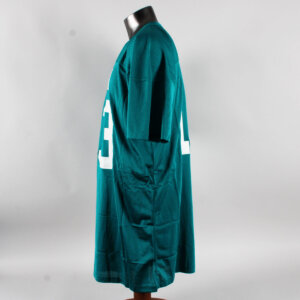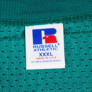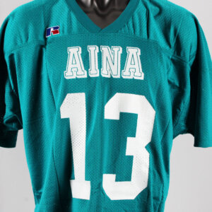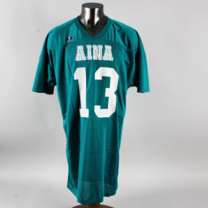 Presented is a green 2002 Hula Bowl game-issued jersey. This Rawlings jersey was issued to Alex Brown who was a defensive end from the University of Florida. The jersey features his number identifiers “13” in white on the front and back. AINA is across the front chest. Russell Athletic tagging in the collar XXXL with the extra length 4″ (along with the embroidered logo on the front). American flag patch on the verso. The jersey shows no wear and was issued for the contest.