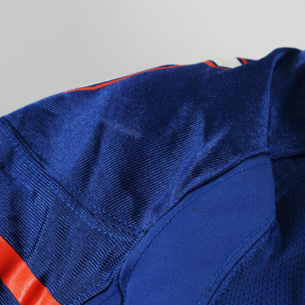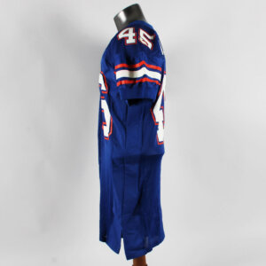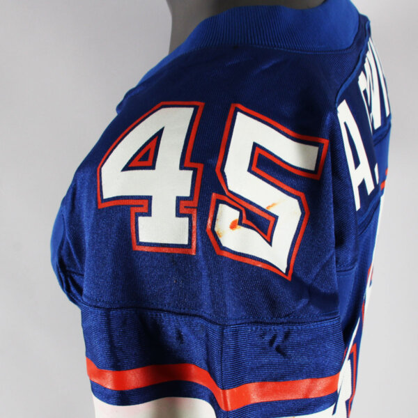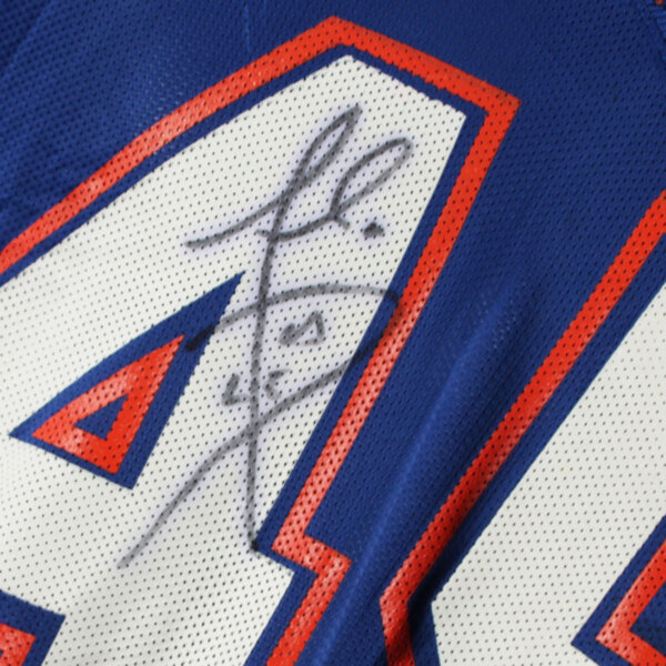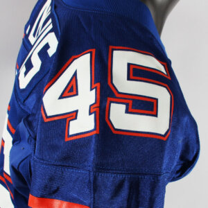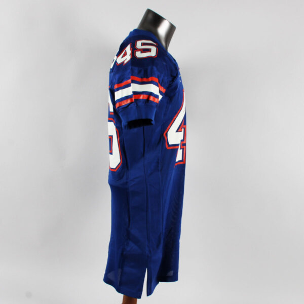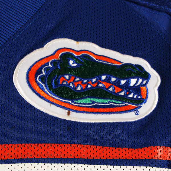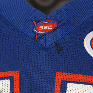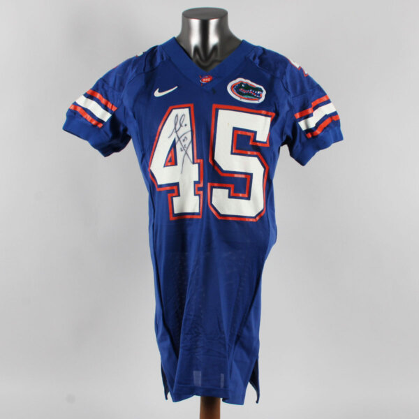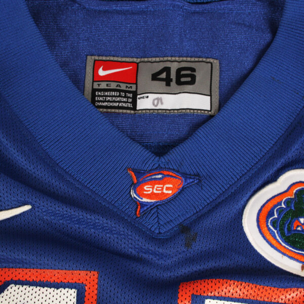 Presented is a blue jersey that was game worn by former University of Florida Gators player, Andra Davis duing the 2001 season. On the front, back, and shoulders is the player number “45” screened on in white and orange. The Gator patch logo is present on the left chest and the sides are Spandex and the custom elastic sleeves are striped in team colors white and orange. Across the back is his name “A. DAVIS” in white on a nameplate. The collar tagging shows it is a Nike [size 46) with a handwritten in black felt tip 01 for the season. The SEC patch is set in the center collar portion. It shows wear throughout with field/hit marks etc. The highlight was it was autographed on the front number by Davis. Overall, a great Gators game worn jersey.