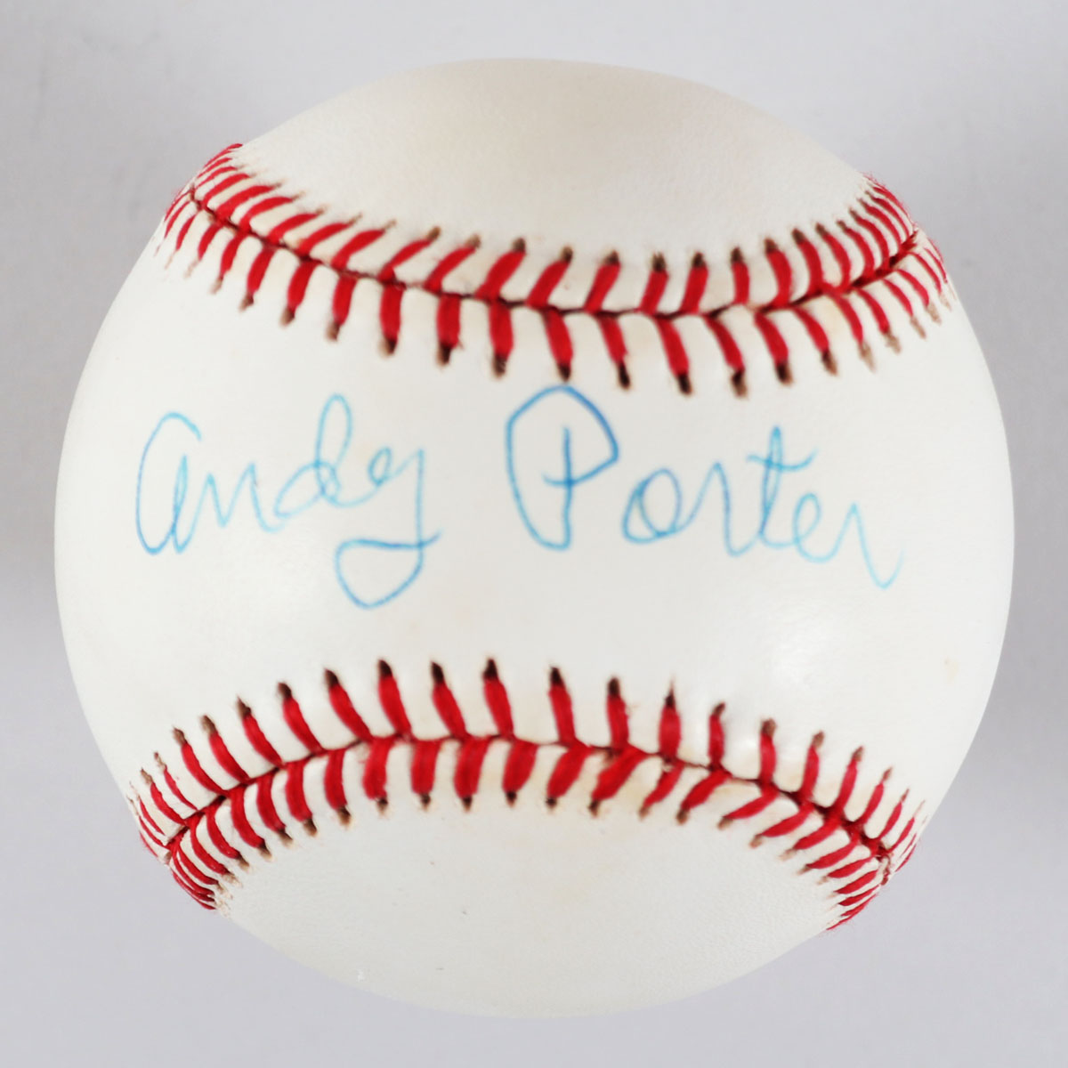 Presented is an ONL (White) baseball autographed by Andy Porter. He signed it on the sweet spot in blue ballpoint (“8-9”). The baseball itself shows mild toning from age.