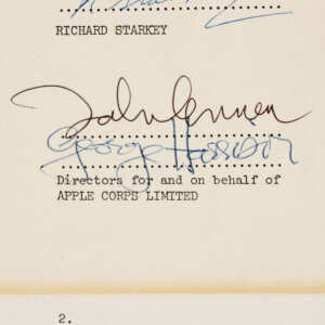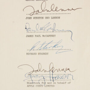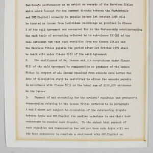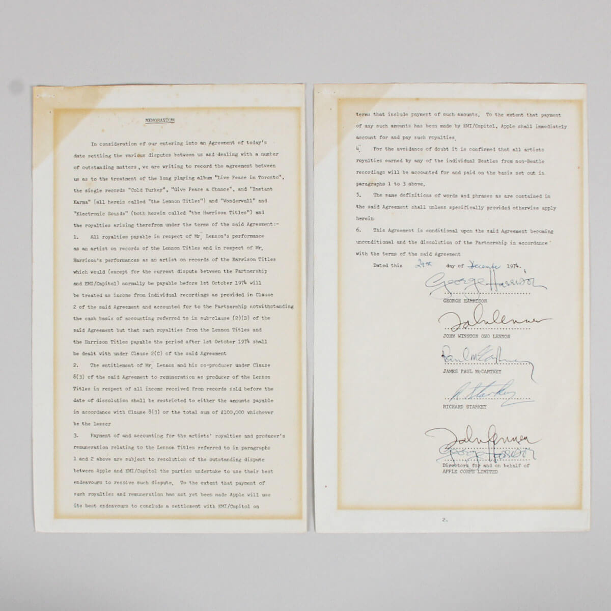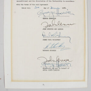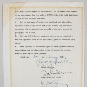 This document is the addendum to the DISSOLUTION OF THE PARTNERSHIP of the Beatles in 1974. As necessary as the Beatles’ first appearance and first contract with Ed Sullivan, the contract and history of the Beatles’ Dissolution are just as important. APPLE CORPS Limited Dissolution of Contract Addendum Signed by All Four Beatles “The Beatles Break-Up Contract”