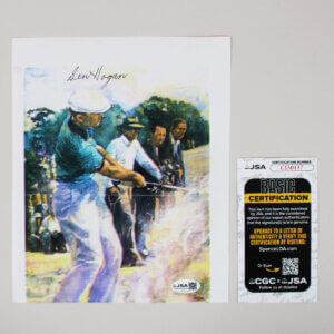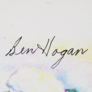 This exquisite item features a signed page from the esteemed golfer Ben Hogan, measuring 7 1/2 x 9 1/4 inches. The page displays a noticeable crease in the center, yet the signature, rendered in black ink, has been graded at an impressive 9. Accompanied by a Certificate of Authenticity from JSA, this piece is a valuable addition for any serious collector or enthusiast of golf memorabilia.