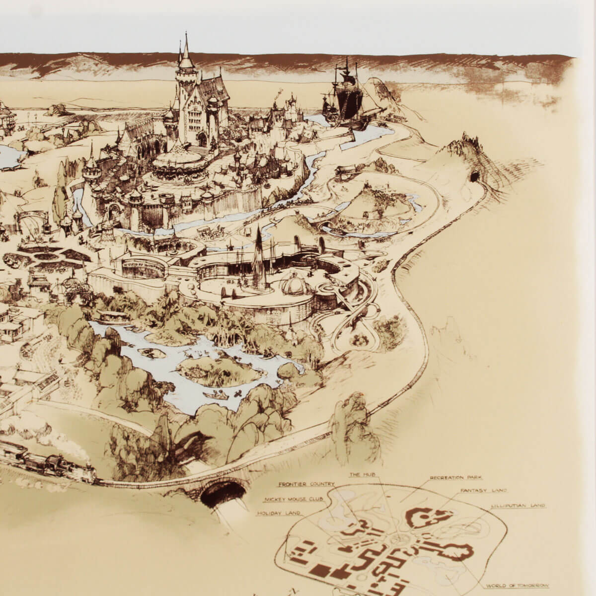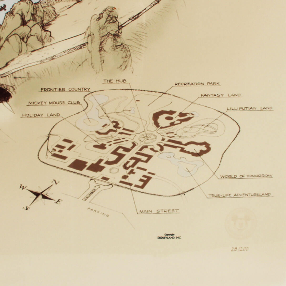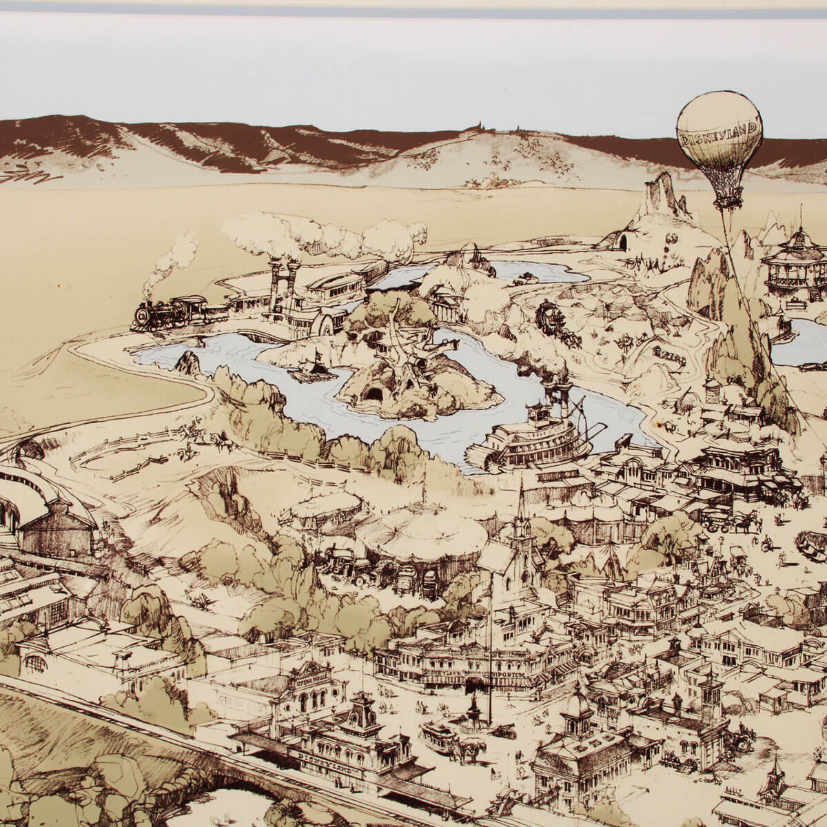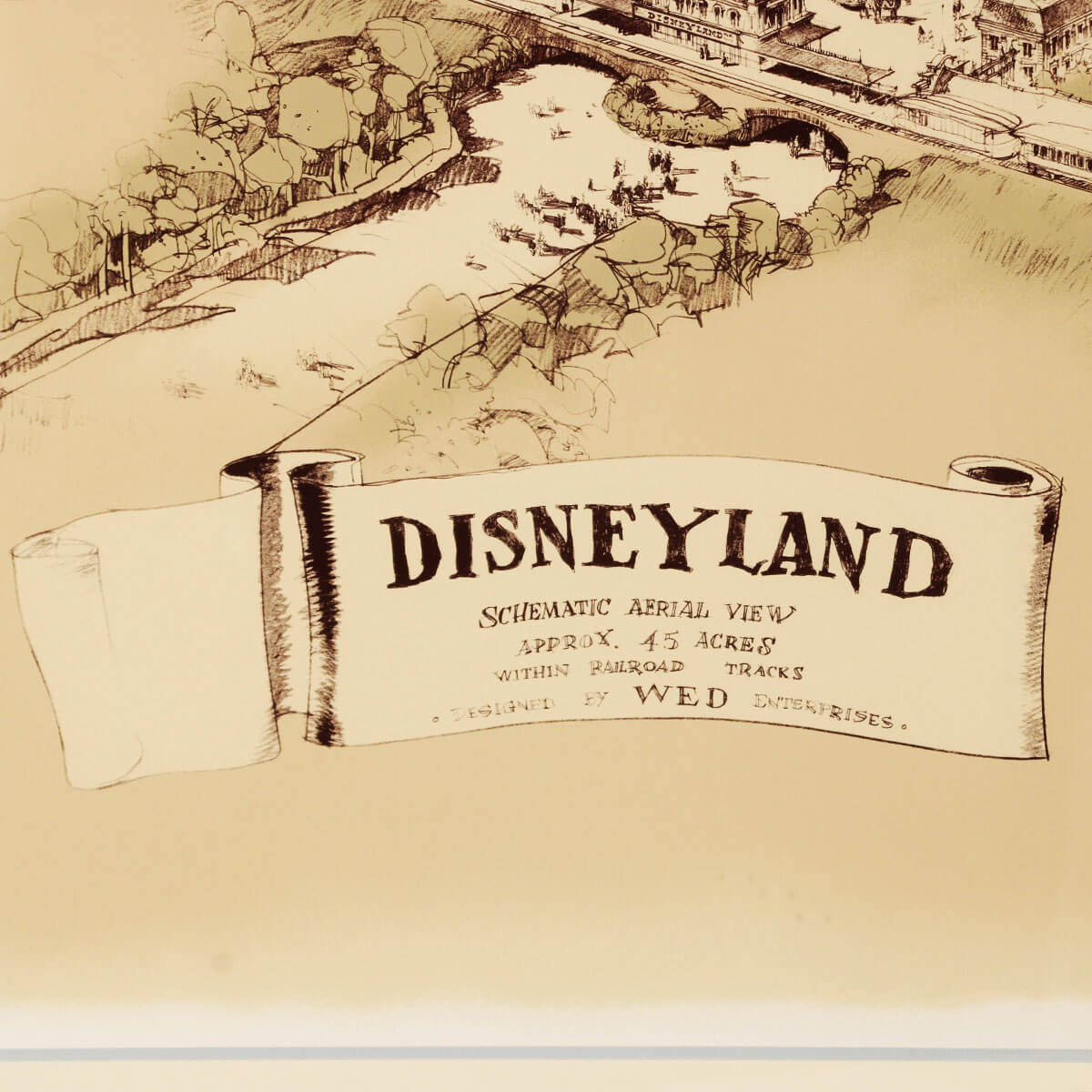 A very rare high-quality print of Herb Ryman’s original concept design for Disneyland. The original artwork was created by Ryman in 1953 to be used by Walt and Roy to pitch the idea for a Disney theme park to investors. This large reproduction of the artwork is an extremely rare representation of Disneyland’s early history. This concept shows the immense amount of detail and care that Ryman put into the initial design of Disneyland. The bottom-right corner has a subtle Disney seal and the number 28/200. The framed print has an image size of 32″x50″ within its 42.5″x 61″ frame.