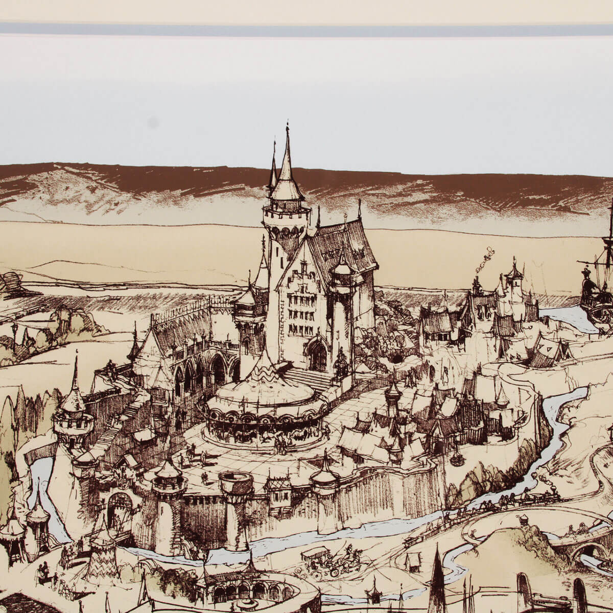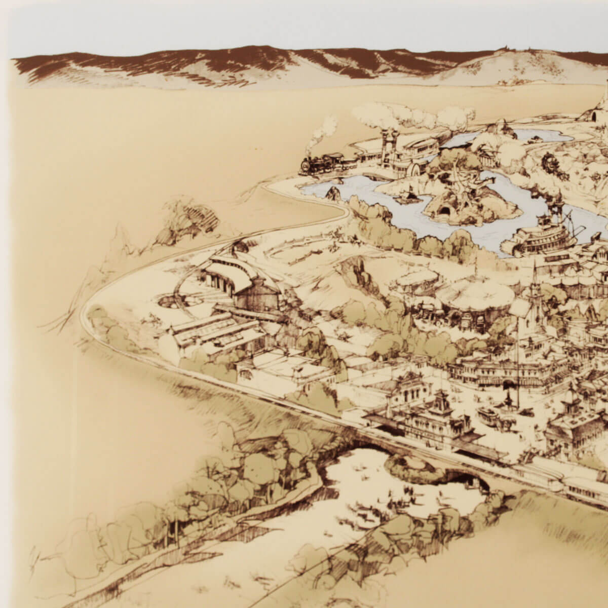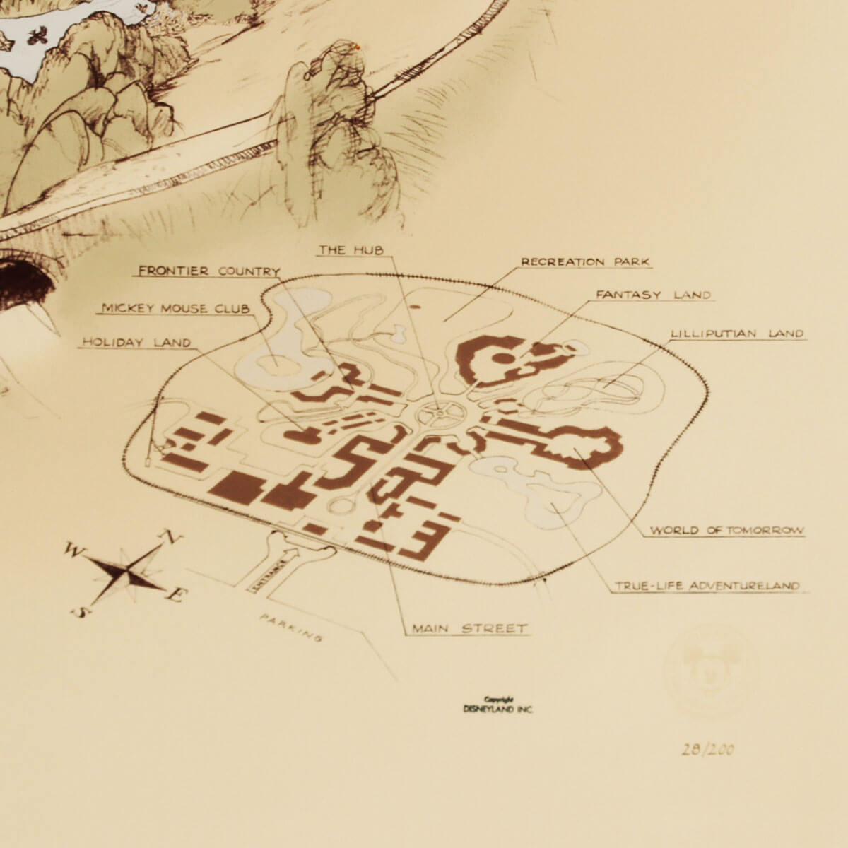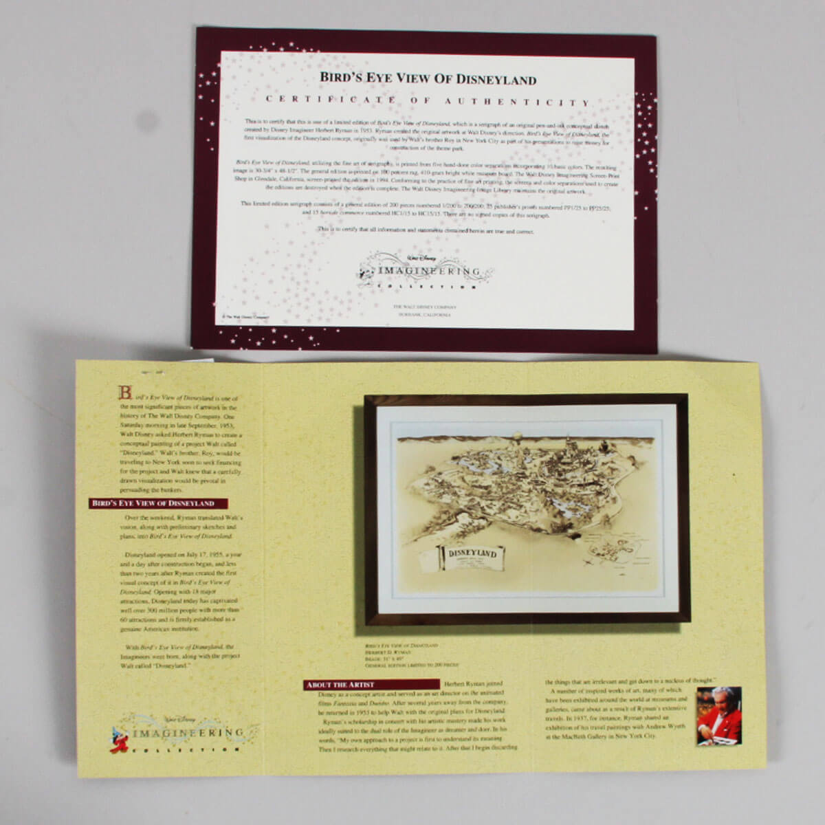 A very rare high-quality print of Herb Ryman’s original concept design for Disneyland. The original artwork was created by Ryman in 1953 to be used by Walt and Roy to pitch the idea for a Disney theme park to investors. This large reproduction of the artwork is an extremely rare representation of Disneyland’s early history. This concept shows the immense amount of detail and care that Ryman put into the initial design of Disneyland. The bottom-right corner has a subtle Disney seal and the number 28/200. The framed print has an image size of 32″x50″ within its 42.5″x 61″ frame.