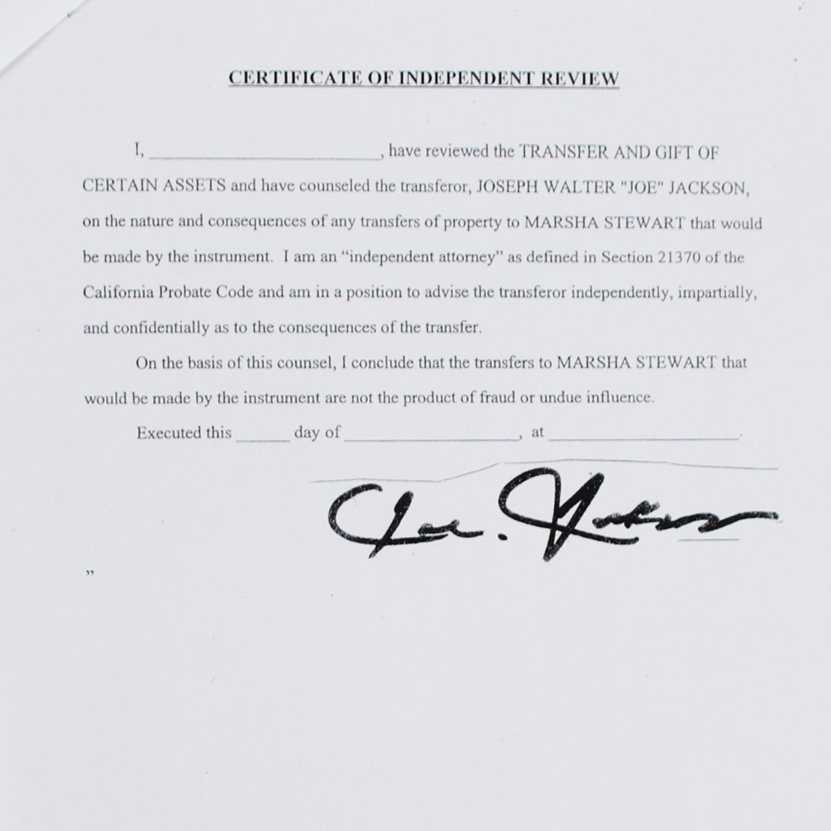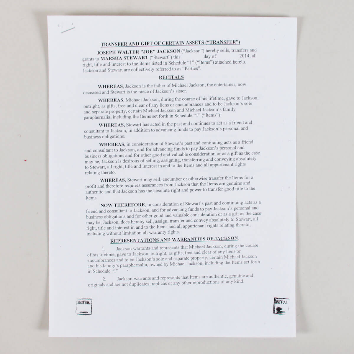There are several legal documents proving that as part of the Jackson family, Stewart was gifted these items and that she is the sole owner of these items. As provenance for the Jackson items being sold from this collection, we have included copies of these documents as well as a signed letter from Marsha Stewart.