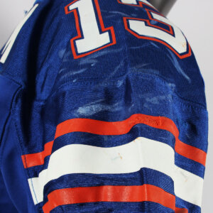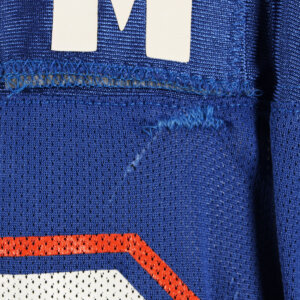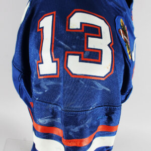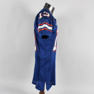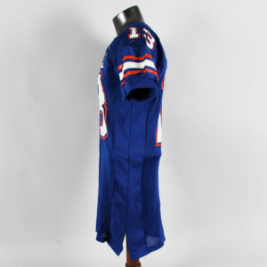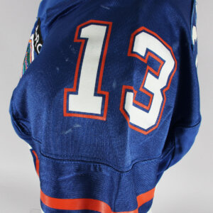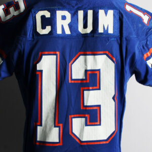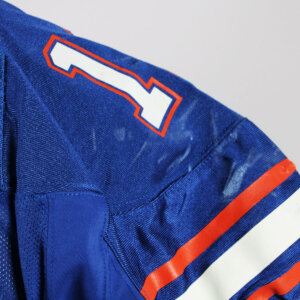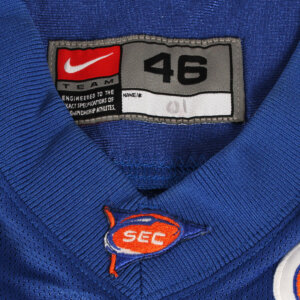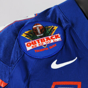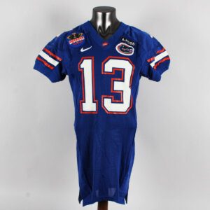 Presented is a blue University of Florida jersey that was game worn by former Gators player, Brian Crum a linebacker during his college career. This was worn during the Outback Bowl. On the front, back, and each shoulder is the player number “13” screened on in white and orange. The Gator patch logo is present on the chest along with the Gators Outback Bowl, sides are Spandex and the custom elastic sleeves are striped in team colors orange and white.