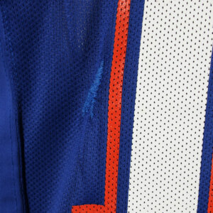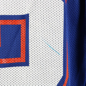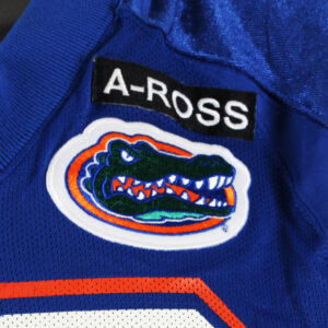 The Gator patch logo is present on the chest along with the special A-Ross patch for Eraste Autin, sides are Spandex and the custom elastic sleeves are striped in team colors orange and white. Across the back is his name “CRUM” in white on a nameplate. The collar tagging shows it is a Nike [size] 46 with special notes by equipment manager.  The SEC patch is set in the center collar portion.  It shows tremendous wear/use overall with hit/field/scrape marks and several repairs etc. Overall, a great Gators game worn jersey.