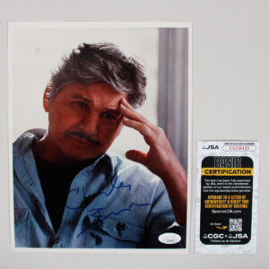 This remarkable 8×10 photograph of Charles Bronson is elegantly signed in blue ink, showcasing a signature that is professionally graded at 9. Accompanied by a Certificate of Authenticity from JSA, this item not only serves as a striking piece of memorabilia but also as a testament to the legendary actor’s enduring legacy. The photo is in excellent condition, making it a valuable addition for collectors and fans alike. Secure this unique signed piece to celebrate the iconic career of Charles Bronson.