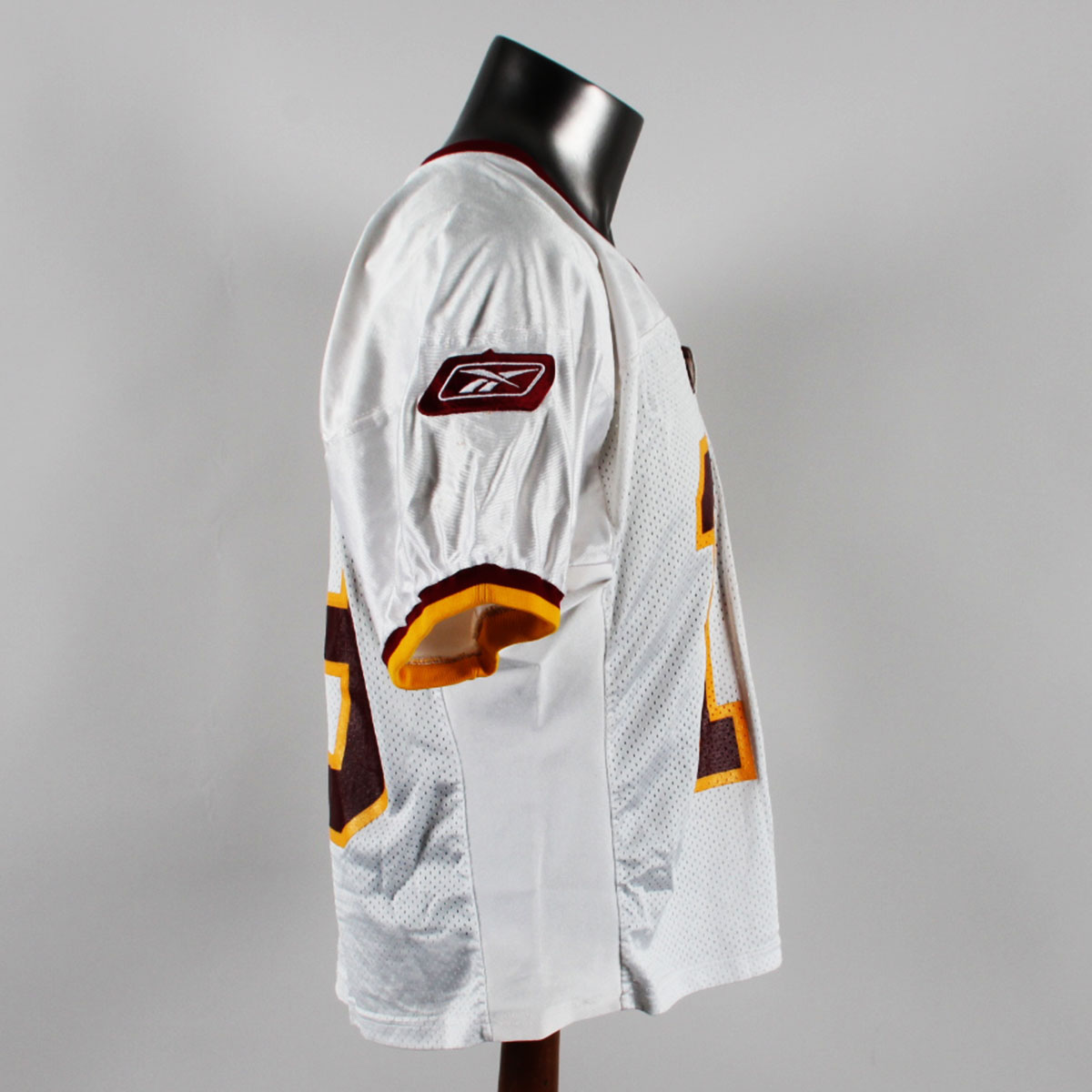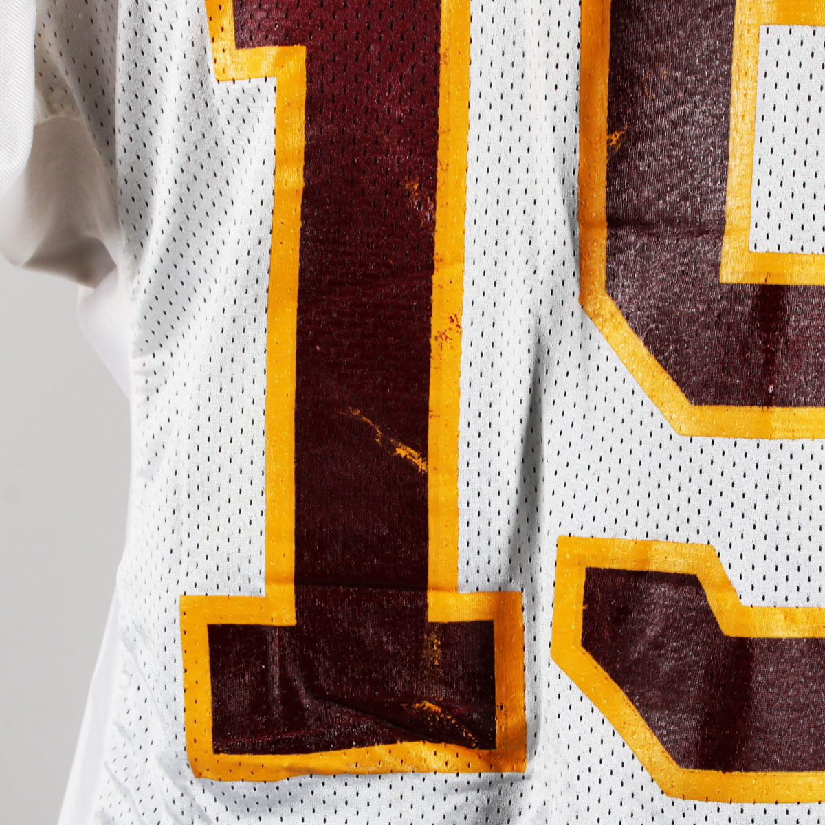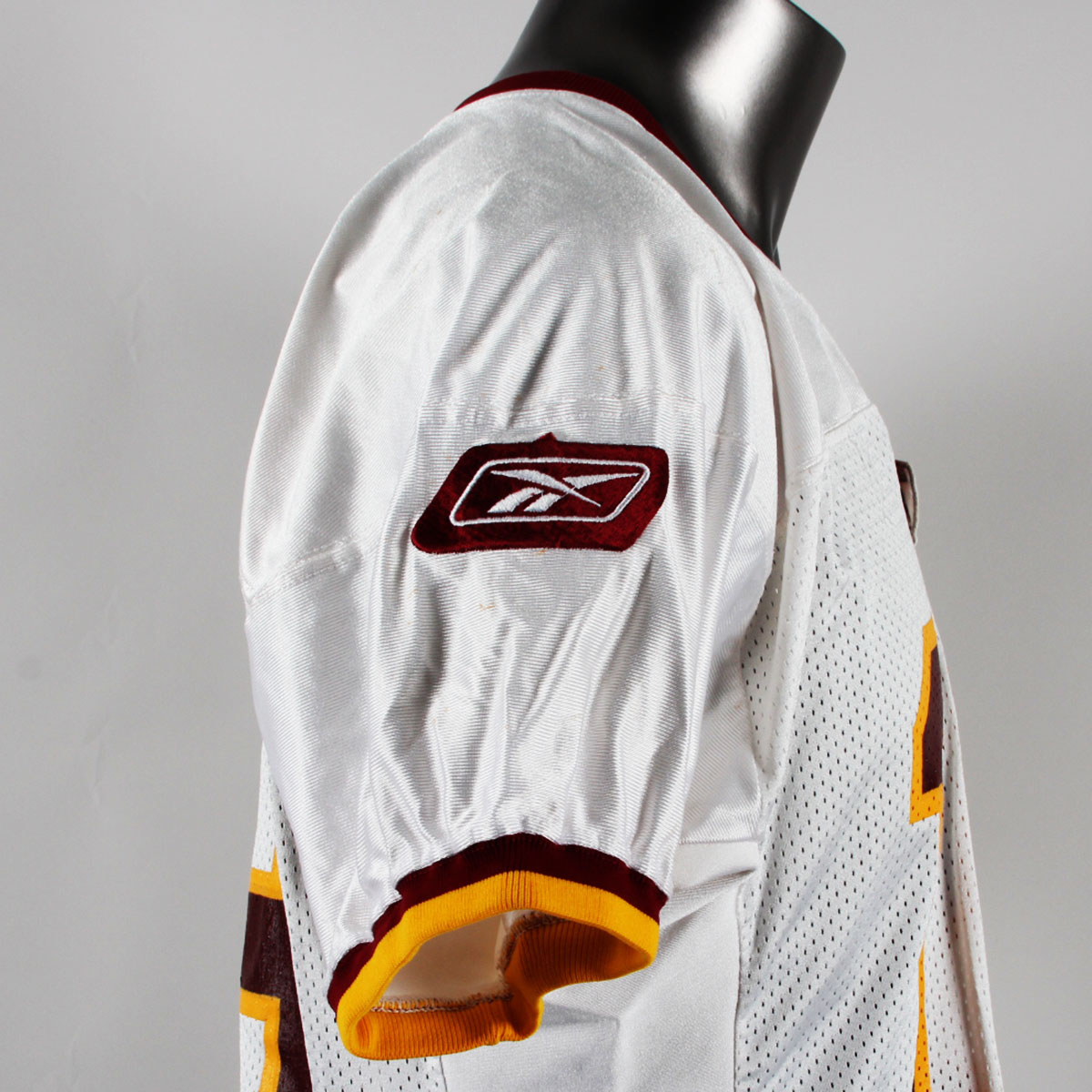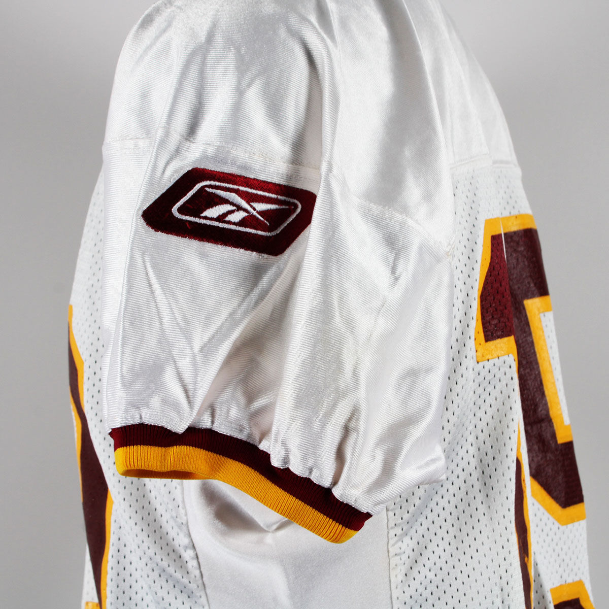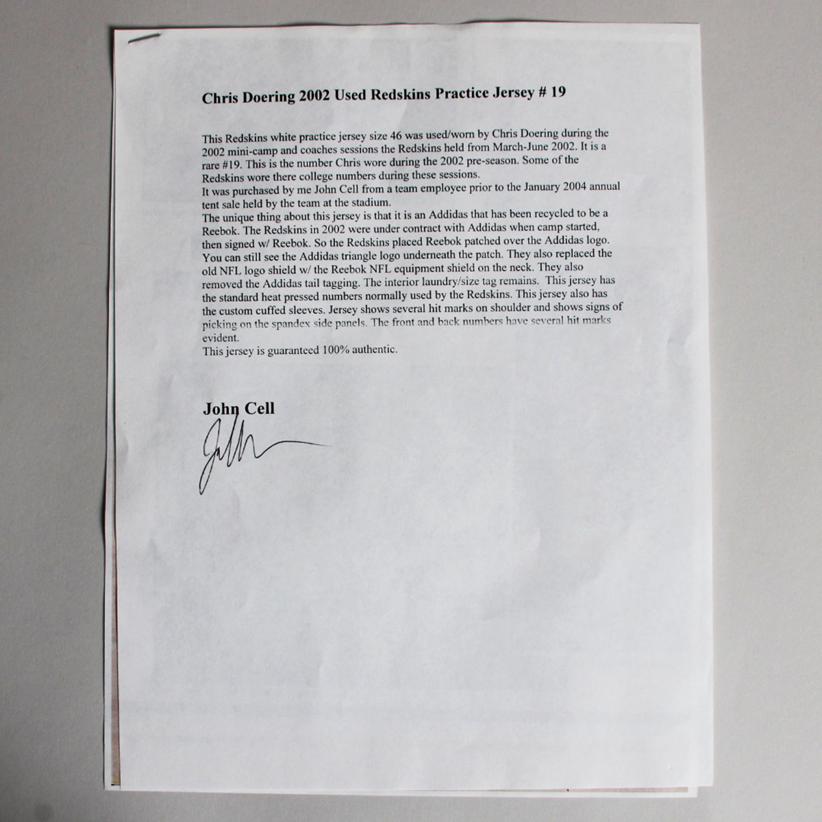 Presented is a Washington Redskins practice jersey that was worn by Chris Doering in the minicamp 2002. Interestingly as the provenance notes, the Adidas jersey was converted to Reebok with patches, NFL shield, removed tail tagging etc. The white jersey features the Redskins colors on the front and verso identifiers in two-color (yellow/maroon) tackle twill “19”. There’s no name on the back nameplate for practice. Both sleeve ends are elasticized and it is custom hemmed for the player. The jersey shows great wear throughout with a lot showcased on the identifiers.