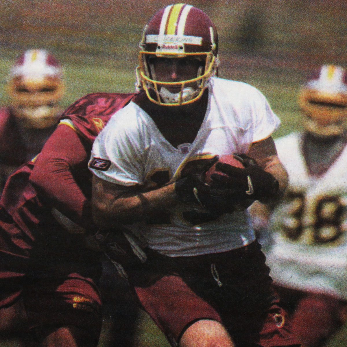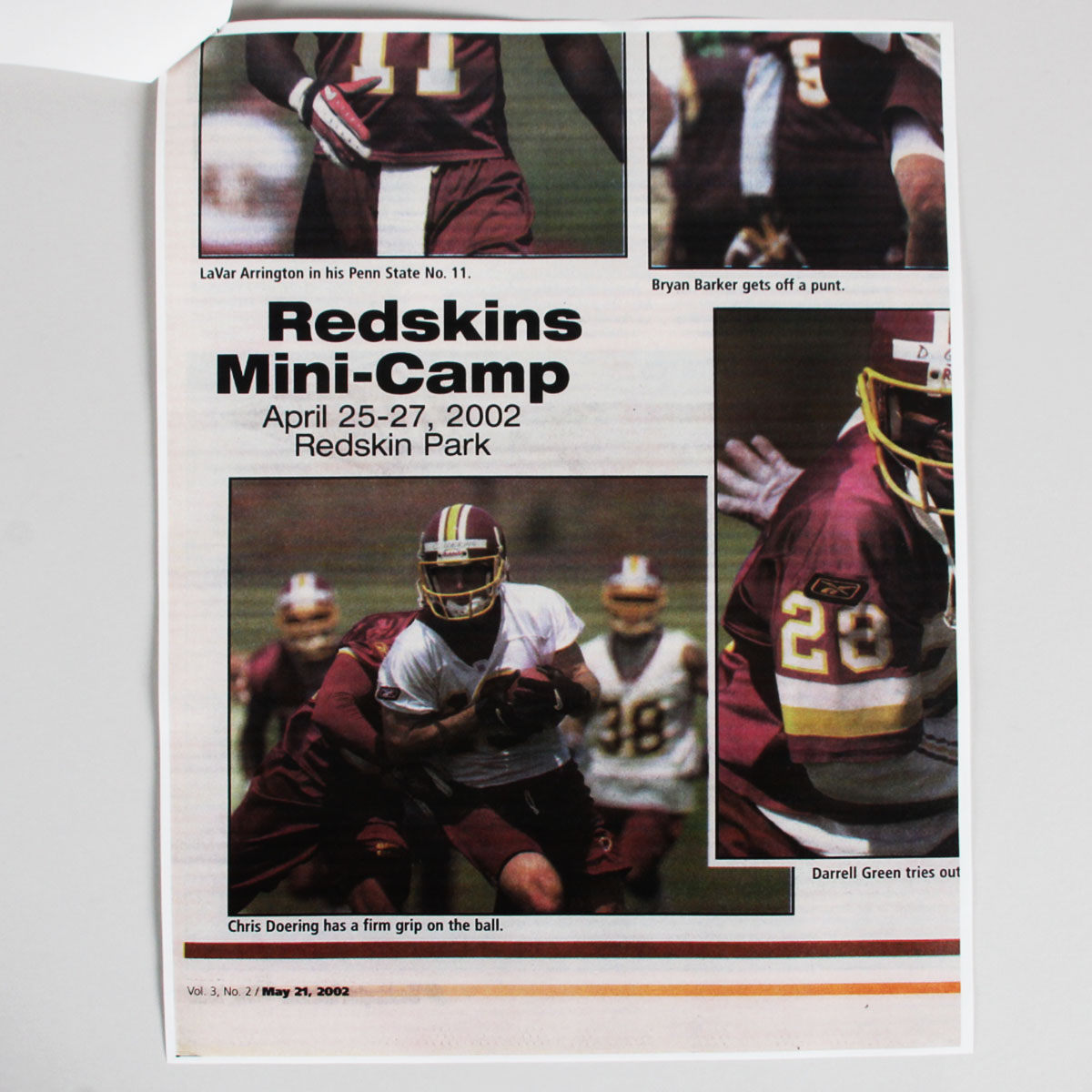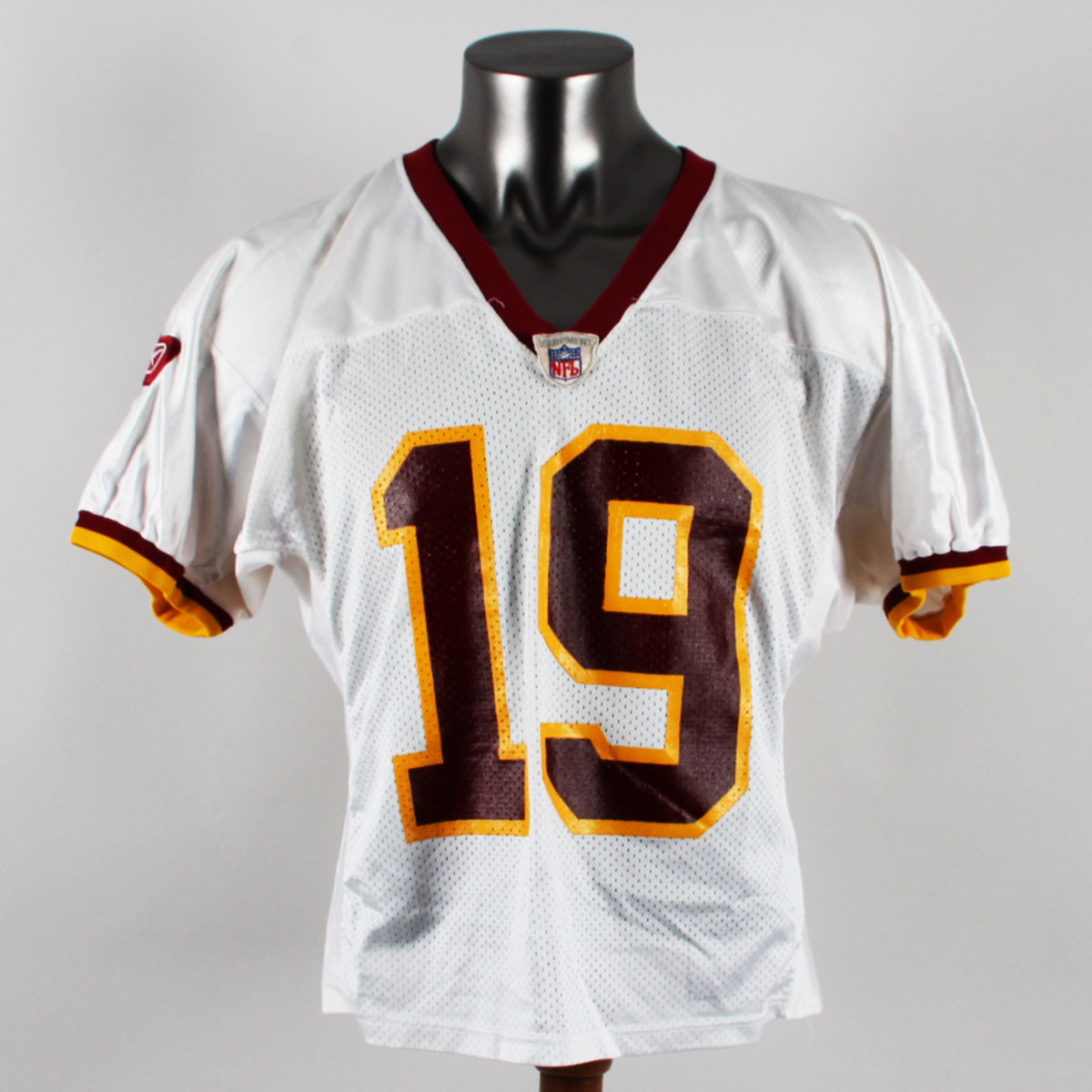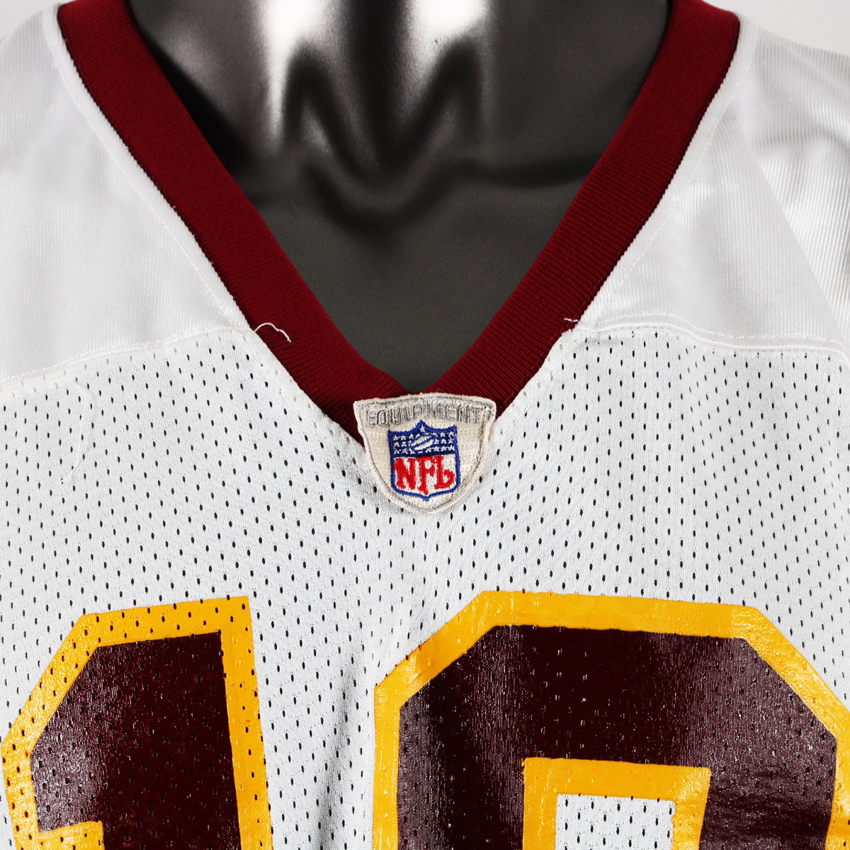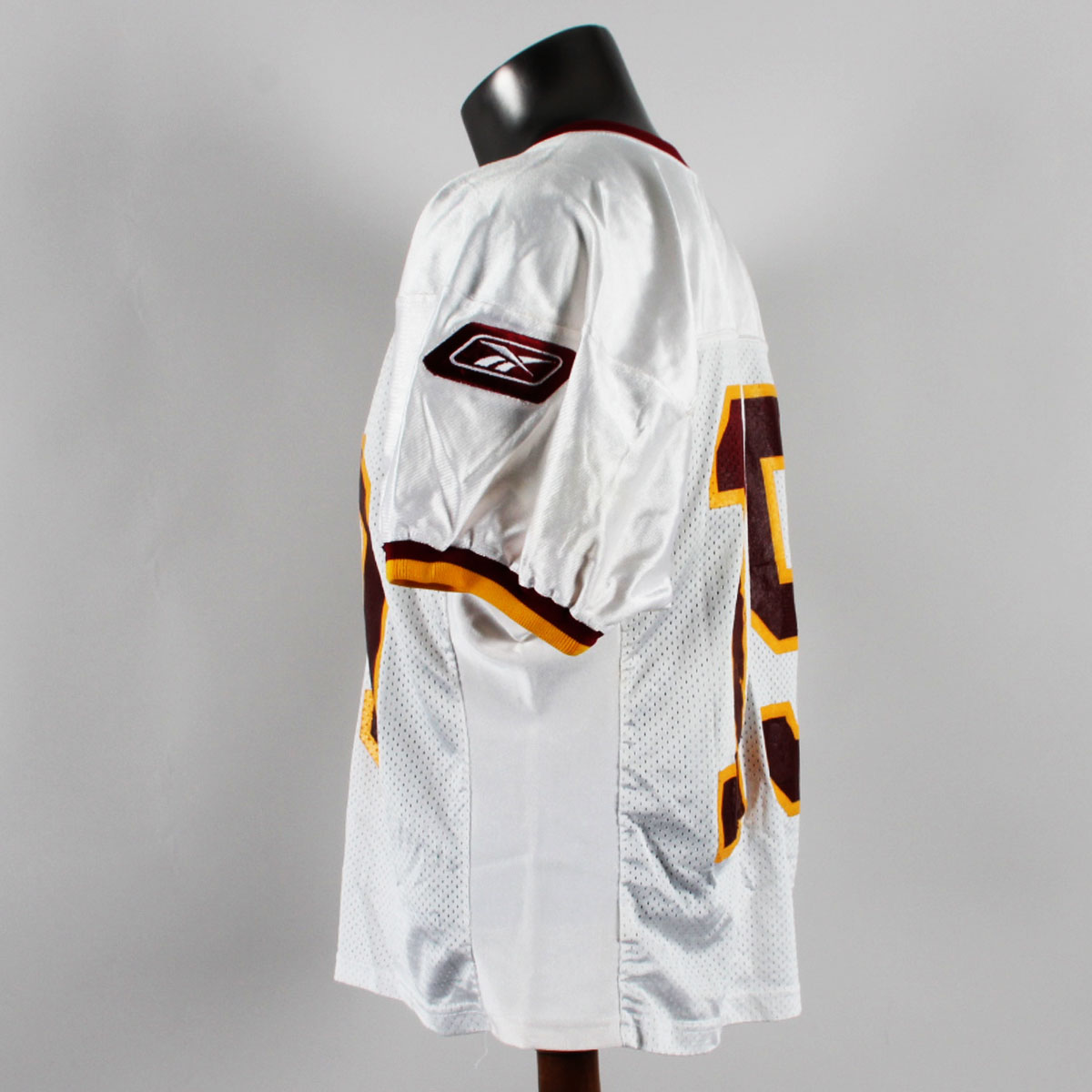 Presented is a Washington Redskins practice jersey that was worn by Chris Doering in the minicamp 2002. Interestingly as the provenance notes, the Adidas jersey was converted to Reebok with patches, NFL shield, removed tail tagging etc. The white jersey features the Redskins colors on the front and verso identifiers in two-color (yellow/maroon) tackle twill “19”. There’s no name on the back nameplate for practice. Both sleeve ends are elasticized and it is custom hemmed for the player. The jersey shows great wear throughout with a lot showcased on the identifiers.