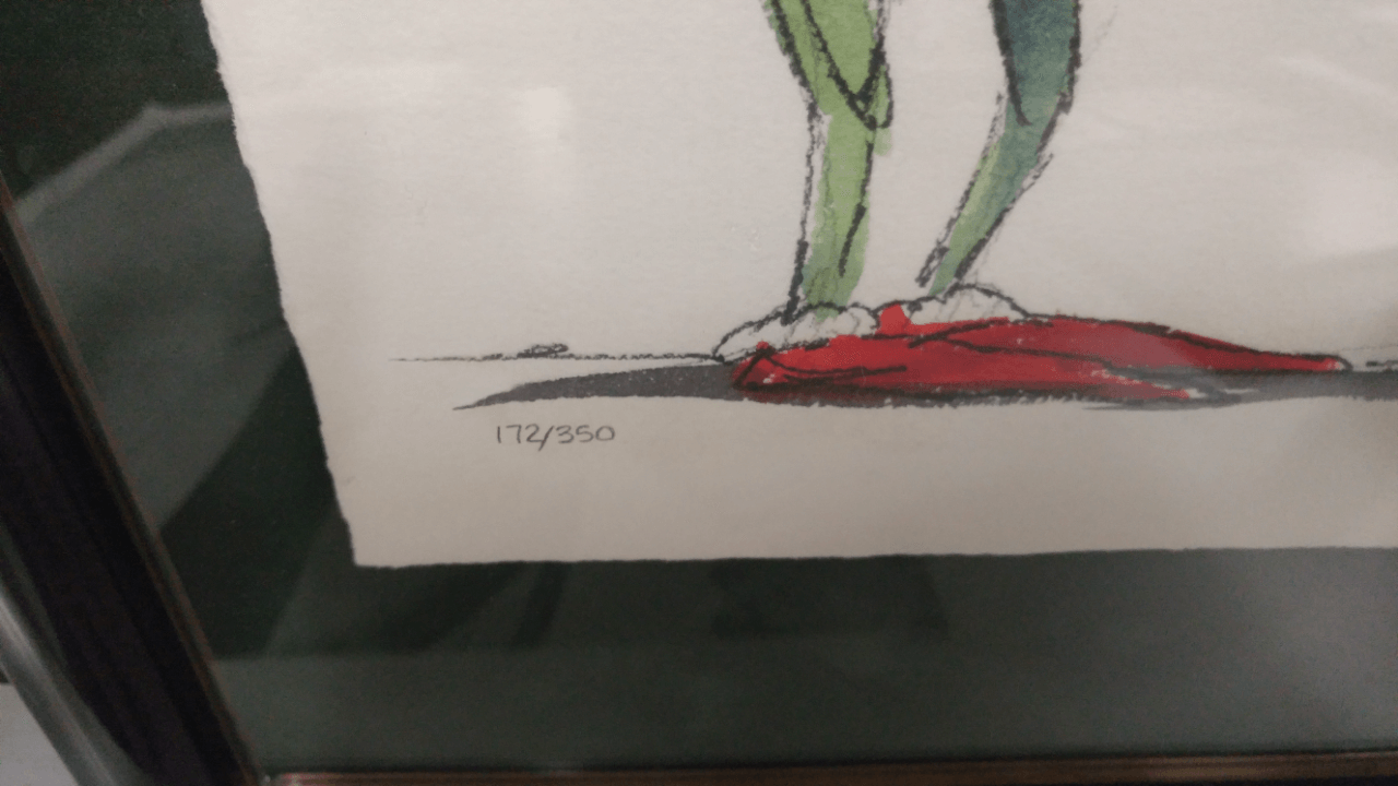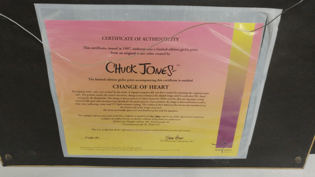 This 1998 Chuck Jones giclee from the Grinch entitled “Change of Heart.” Change of Heart frame measures 20″x 18″. Giclee measures 15″ x 10.5″ It is number 172/350, titled and signed by Chuck Jones. Included is a certificate from Linda Jones Enterprises, Inc. It truly is a beautiful piece of art!