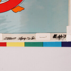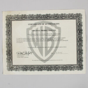 This original film production cel of Daffy Duck, created by Walt Disney in the 1980s, represents a significant piece of animation history. This is a production cel from the 1988 animated film “Daffy Duck’s Quackbusters. The cel is part of a limited edition run. It measures 10” x 12 1/2 in size. The cel captures the iconic character in a moment of delightful expression, showcasing the artistry and craftsmanship that define Disney’s legacy. As a collectible, it holds considerable value for both animation enthusiasts and collectors alike. Its provenance and quality make it a noteworthy addition to any serious collection. Comes with a COA.