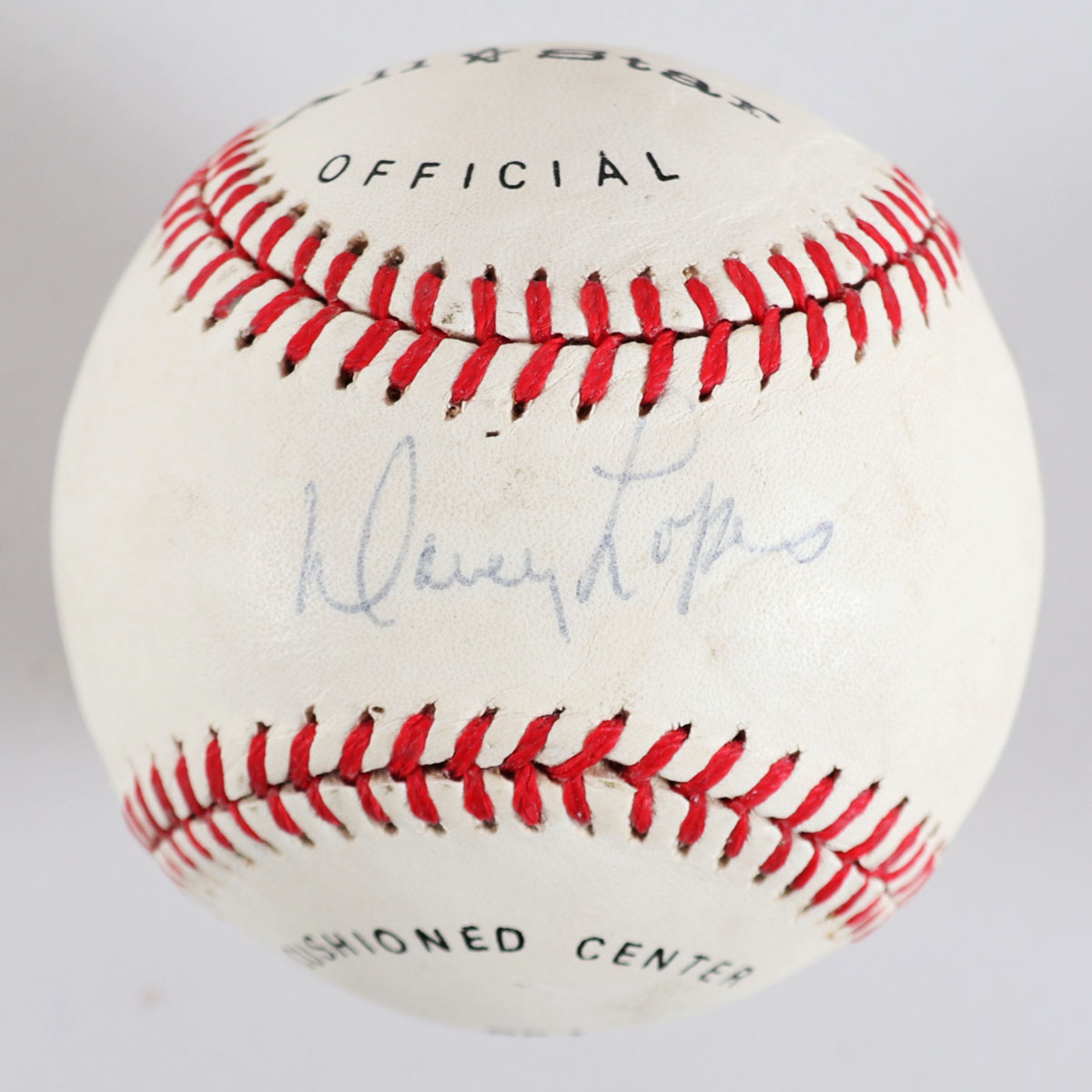 Presented is an unofficial baseball autographed by Davey Lopes. He signed it on the sweet spot in blue ballpoint pen (“7-8”). The ball itself shows toning from age.