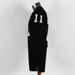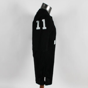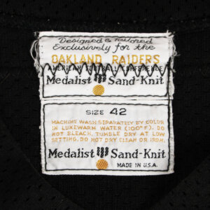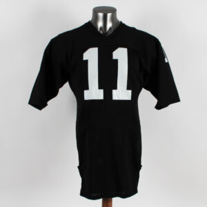 Presented is an Oakland Raiders home game issued jersey dating to David Humm’s tenure with the team circa 19756-79. Medalist Sand Knit [size] 42 & exclusive tags sewn in the collar while identifers in silver including the number 11 is sewn to the front, back and sleeves of the black mesh jersey along with a “HUMM” nameplate on the reverse. There is no wear/use shown on the jersey game issued.