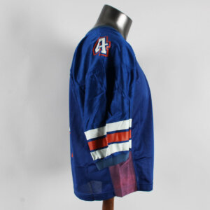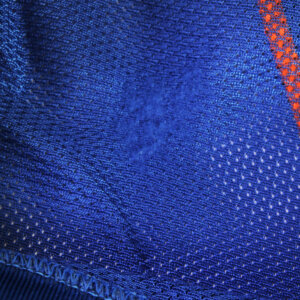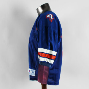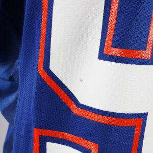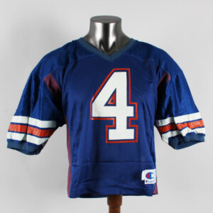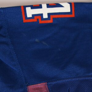 Presented is a blue jersey that was game worn by former University of Florida Gators player, Del Speer in 1991. On the front, back, and each shoulder is the player number “4” screened on in white and orange. The sides are Spandex (purple) and the custom elastic sleeves are striped in team colors orange and white. Across the back is his name “SPEER” in white on a nameplate. The collar tagging shows it is a Champion [size] 44 with fabric swatch. The jersey was custom hemmed along the bottom per player specification. It shows mild wear overall. Overall, a nice Gators game jersey.