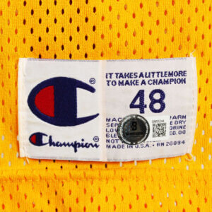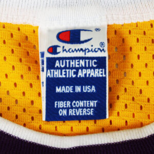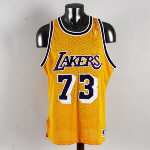 Presented is an authentic Los Angeles Lakers jersey autographed by Dennis Rodman. He signed it along the backside in black felt tip (“9”). The jersey iteself is a Champion [size] 48 and features the gold NBA logo.