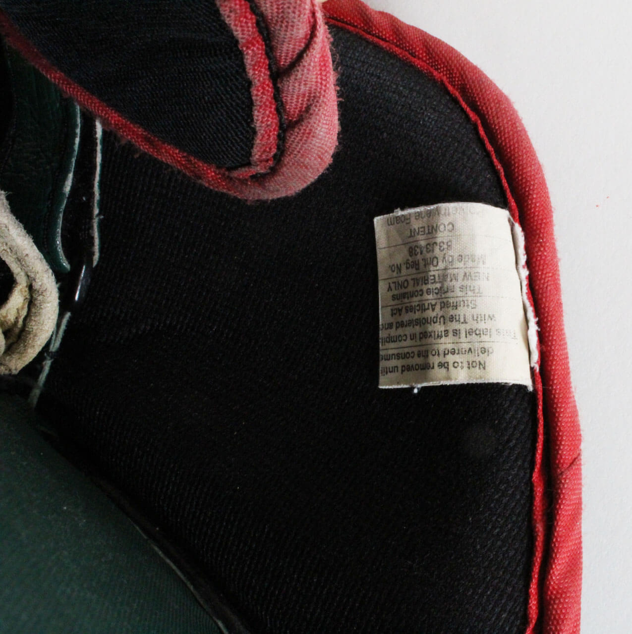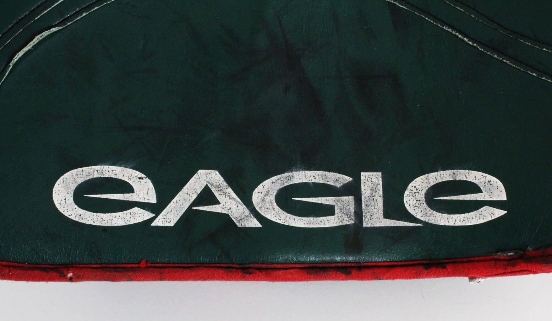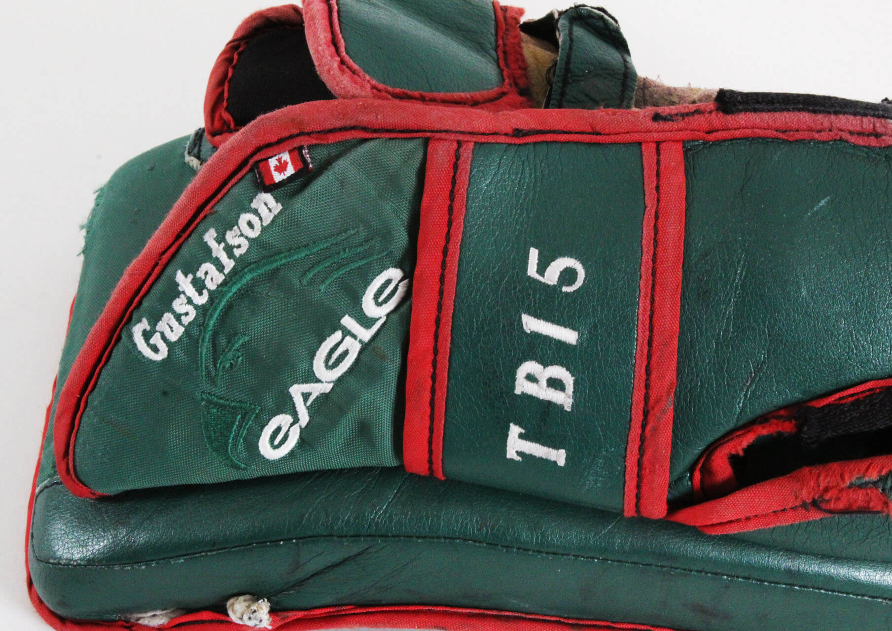 Presented is one of his game-used blocking pads with the Aeros. It is solid green red highlights (team colors). It features custom embroiderery on the surface in white with his name TB15 and the brand name Eagle. Shows very heavy wear throughout with rips, rub, stick marks and overall visible wear.