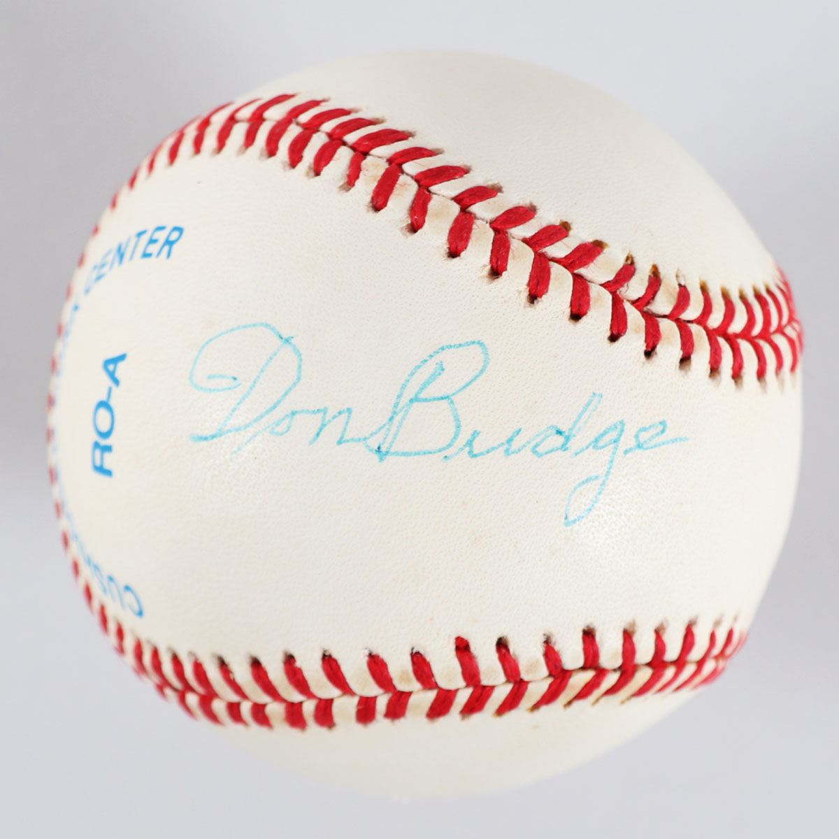 Presented is an OAL (Brown) baseball autographed by Don Budge.  He signed it on the side panel in a blue ballpoint pen (“9”).  The ball itself shows little toning from age.