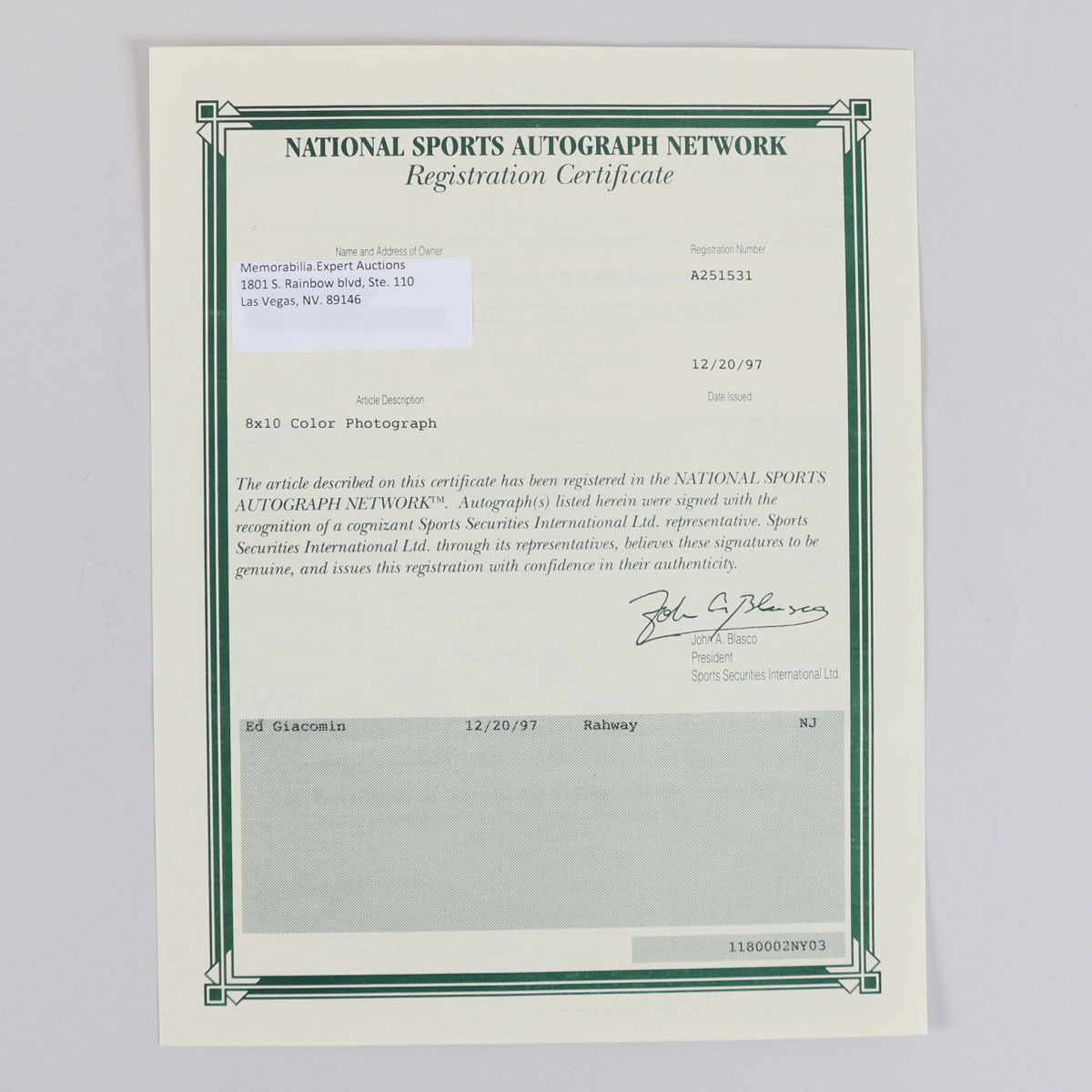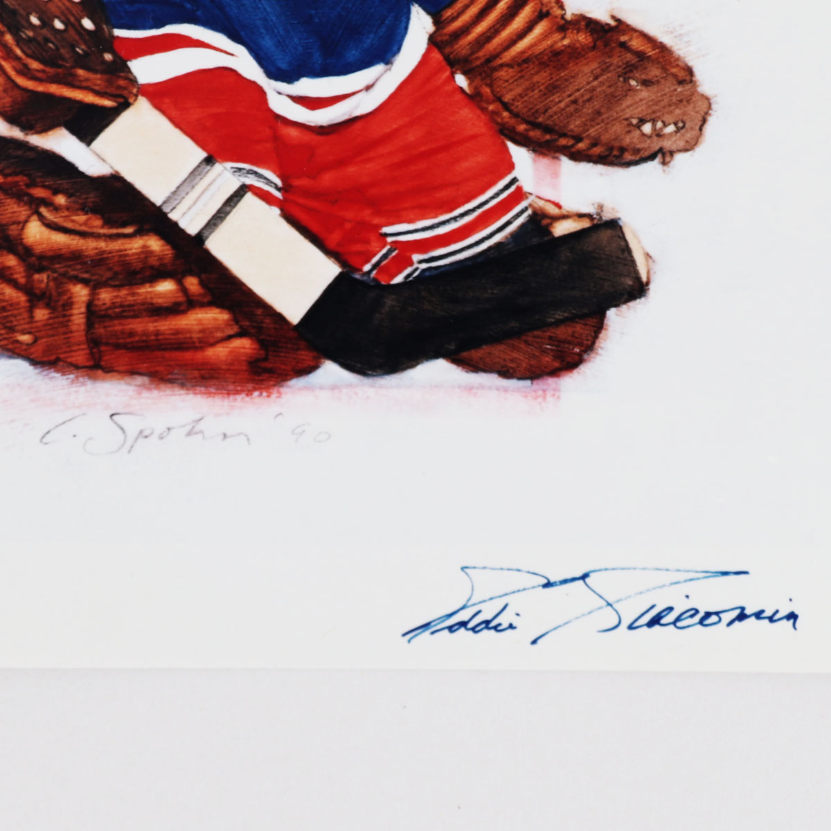 Presented is a 8×10 art style portrait photo autographed by Eddie Giacomin. He signed the photo in blue felt tip (“9”) with the inscription, “H.O.F. 87”.