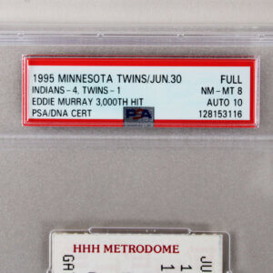 This offering features a full ticket from Eddie Murray’s historic 3000th hit, achieved in 1995 while playing for the Cleveland Indians. The ticket is graded PSA 8, reflecting its excellent condition, while Murray’s autograph is authenticated and graded PSA 10, indicating its superior quality. This collectible is a notable addition for any serious sports memorabilia enthusiast, commemorating a significant milestone in baseball history.