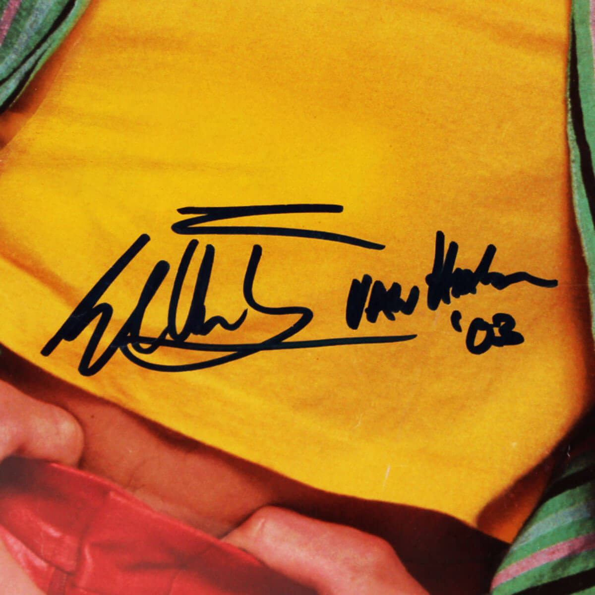Presented is a cool vintage poster of Eddie Van Halen. He signed it in black felt tip pen (“9″) with the inscription ’03 for the year he signed it. The poster itself shows wear from being rolled. It measures 21.5″ x 32.5”.