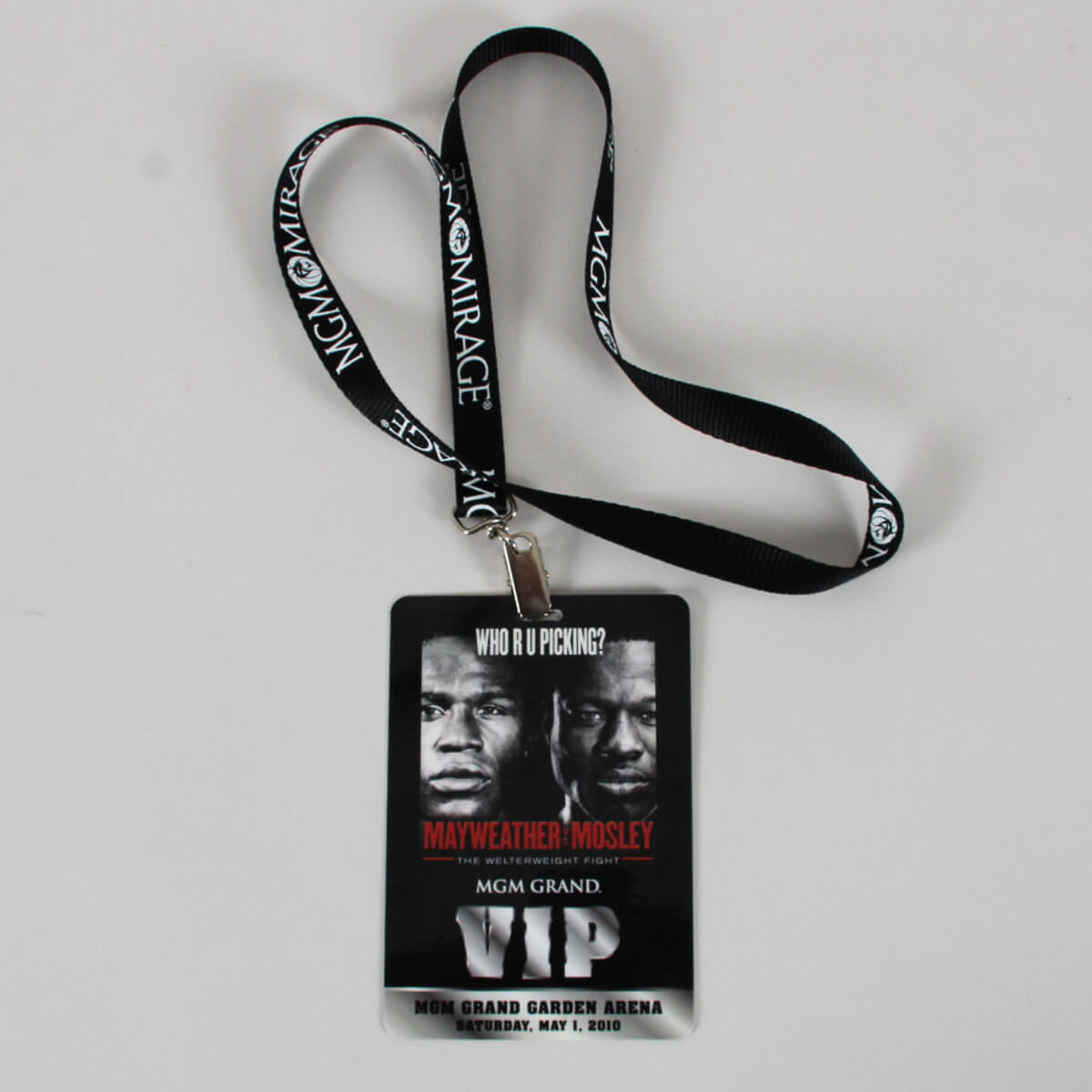 Presented for sale is a VIP pass for the Floyd Mayweather vs. Shane Mosley event on May 1, 2010, complete with a lanyard attached. The pass itself is in NR/Mt condition.