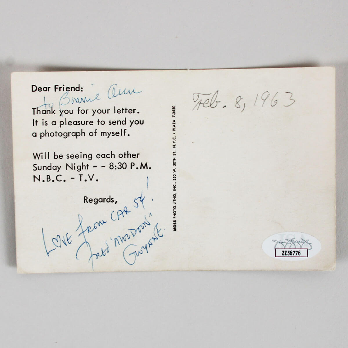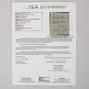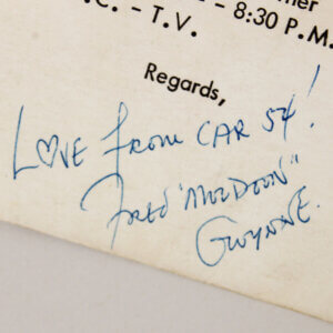 This collectible item features a signed postcard by the esteemed Fred Gwynne, known for his iconic role in the television series Car 54, Where Are You?. The signature, executed in blue ink, is graded at a remarkable 9. This piece not only showcases Gwynne’s autograph but also includes a personal inscription, adding a unique touch to its value. Accompanied by a Certificate of Authenticity from JSA, this postcard serves as a testament to its legitimacy and provenance. Collectors and fans alike will appreciate the significance of this memorabilia, which captures a moment in television history.